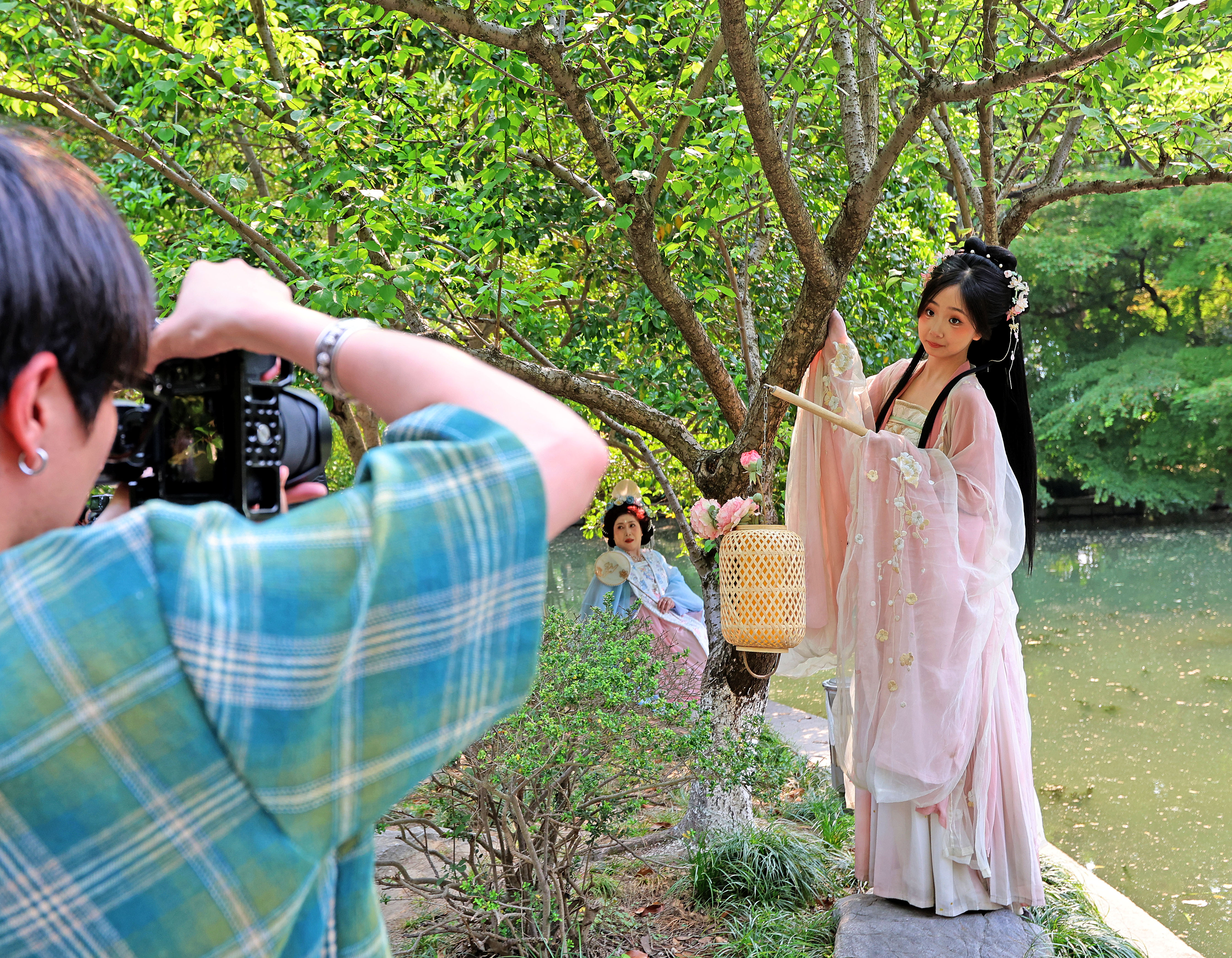 记者放眼望去,操着各地口音的游客中,既有北京姑娘身着齐胸裙,裙裾间绣着敦煌飞天图案;也有新疆小伙头戴东坡巾,手持折扇演绎宋代文人风骨;更有广西姐妹团身着苗族银饰盛装,在湖畔亭台间起舞。据粗略统计,现场游客中90后、00后占比超八成,古装形制涵盖汉、唐、宋、明等多个朝代,甚至不乏融合戏曲元素的创新设计。