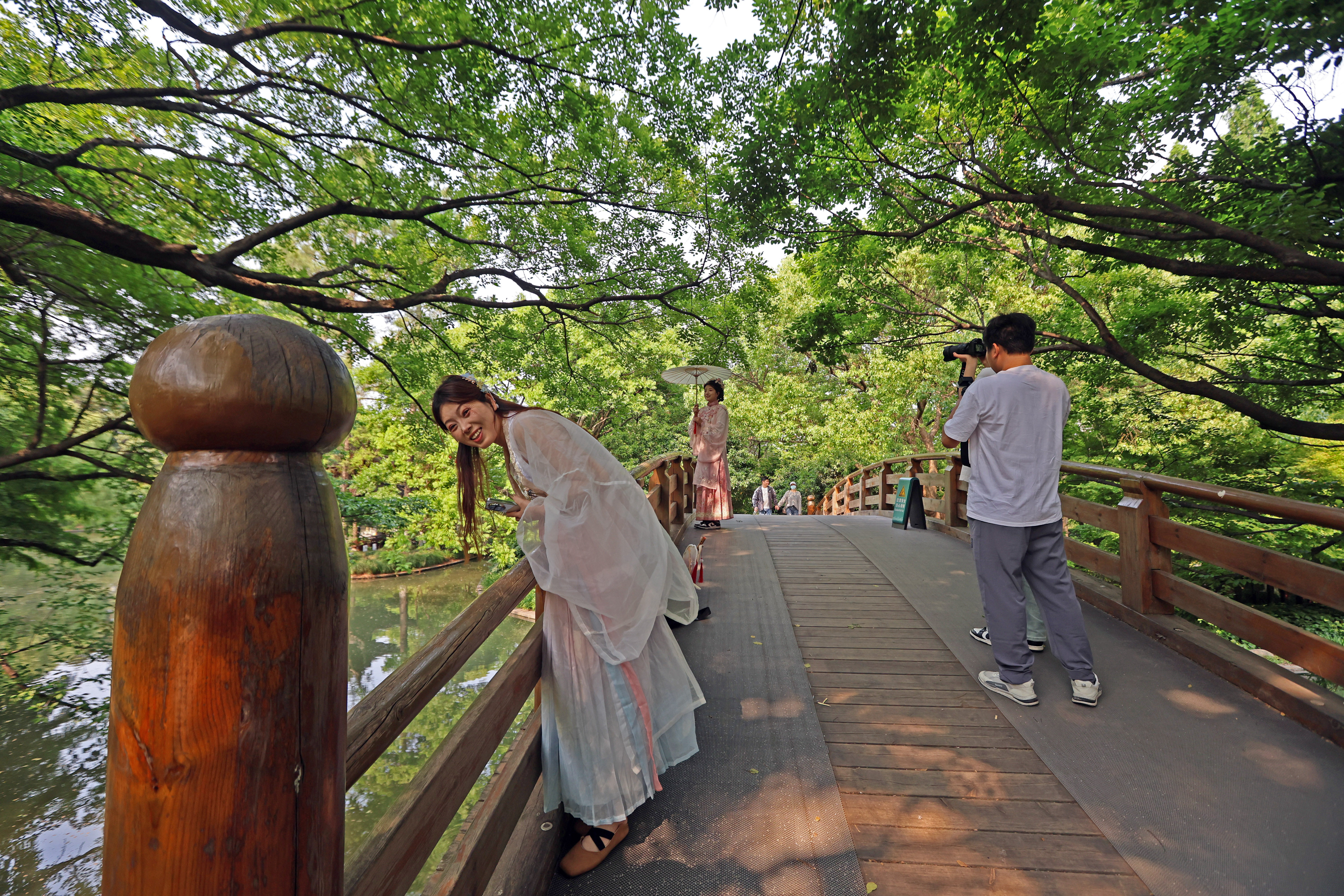 记者发现,其地理位置堪称得天独厚:紧邻西湖游船码头,园子面积虽小,然古亭、曲桥、竹林、荷花池等元素俱全,一步一景皆可入画。更重要的是,这里外围被各种树木簇拥环抱,好似一圈绿墙。恰好契合了年轻人追求“小众打卡地”的心理。
