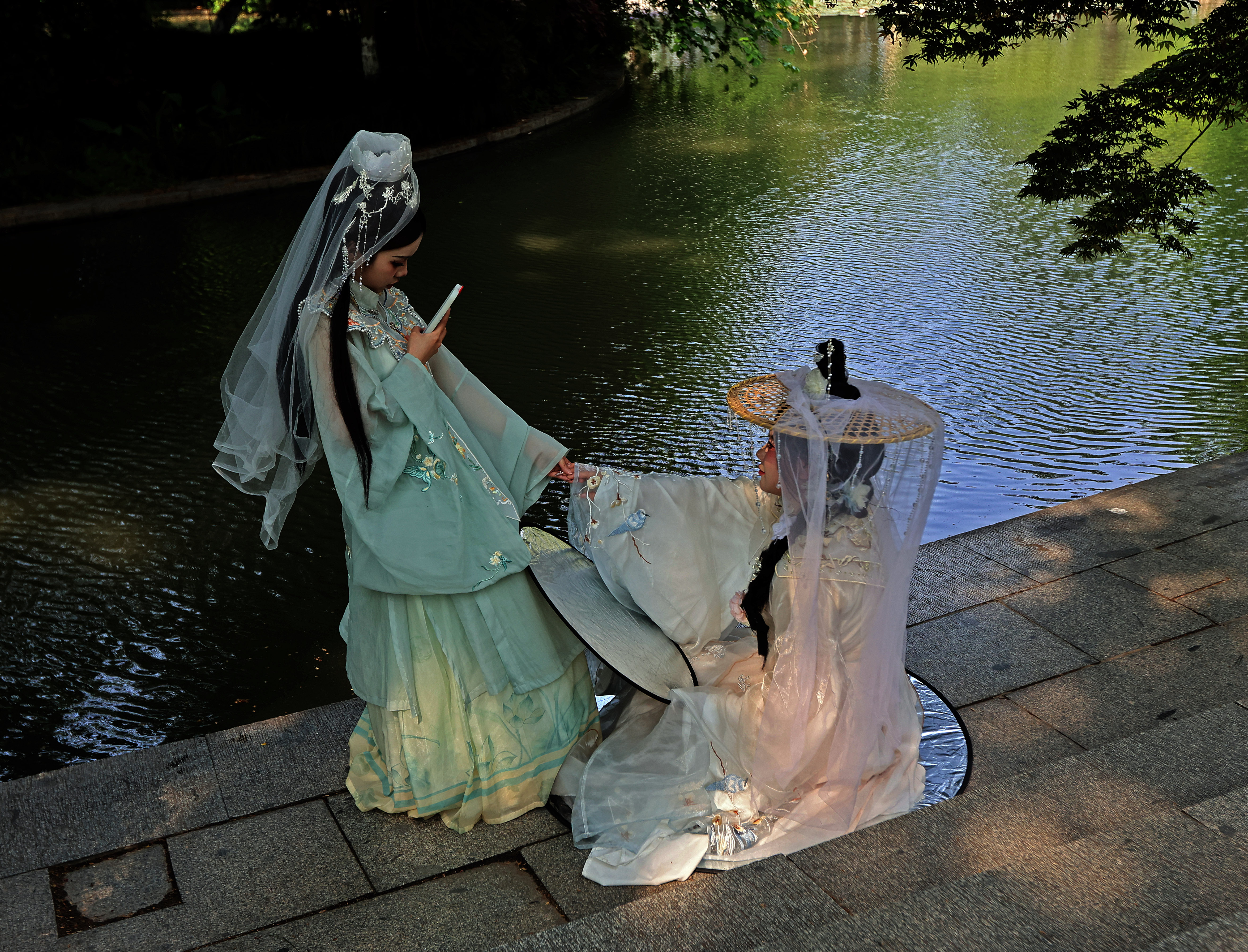 曲径通幽的石板路上,三三两两的“汉服少年”“唐制丽人”结伴而行。广袖流仙裙拂过青苔斑驳的石阶,发间步摇随步伐轻颤,与湖光山色相映成趣。