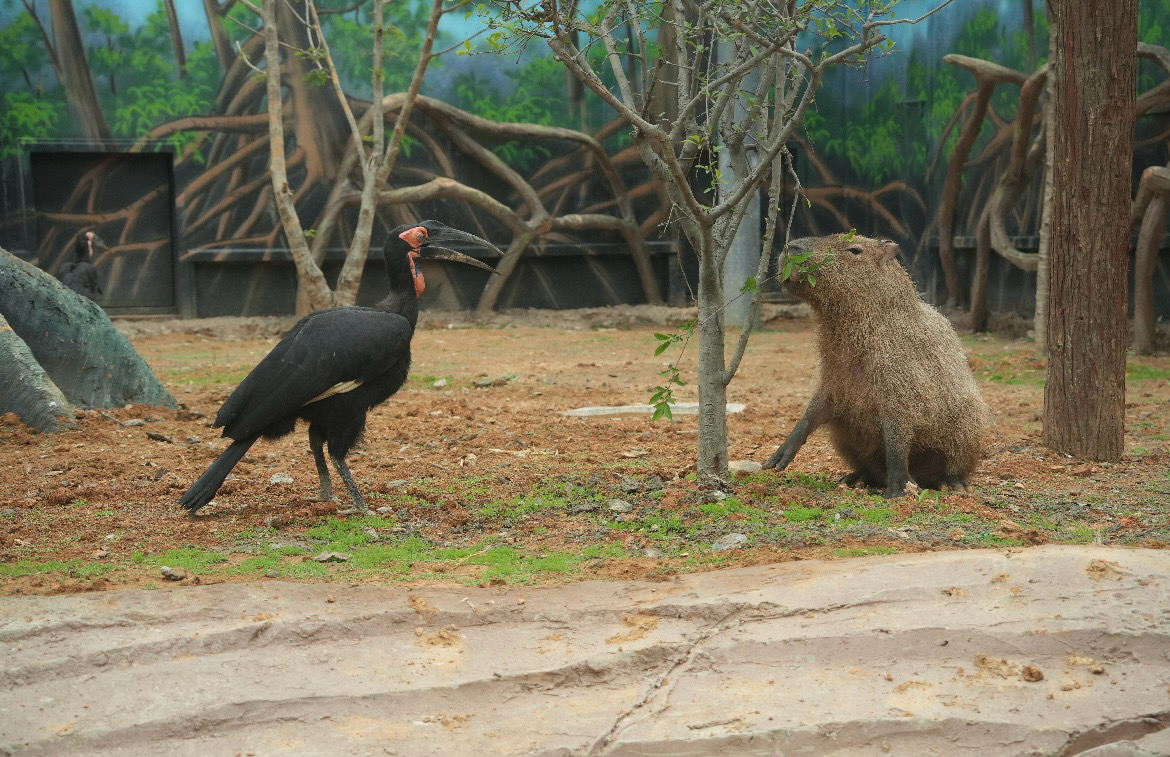 在“缤纷南美”动物展区中,游客会看到这样的景象:“佛系”的“卡皮巴拉”在池塘里泡着澡,一旁的地犀鸟好奇地凑上前去;小食蚁兽在树梢上熟睡,巨嘴鸟轻轻地飞到小食蚁兽的近旁;南浣熊在游客互动区忙着营业,大食蚁兽则悠闲地在后方踱步……
