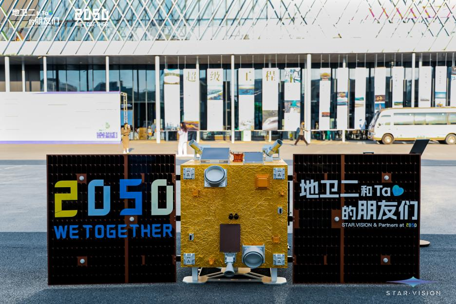 在刚刚过去的2050大会上,记者在场外的航空航天展区,看到一座卫星模型吸引众人围观。