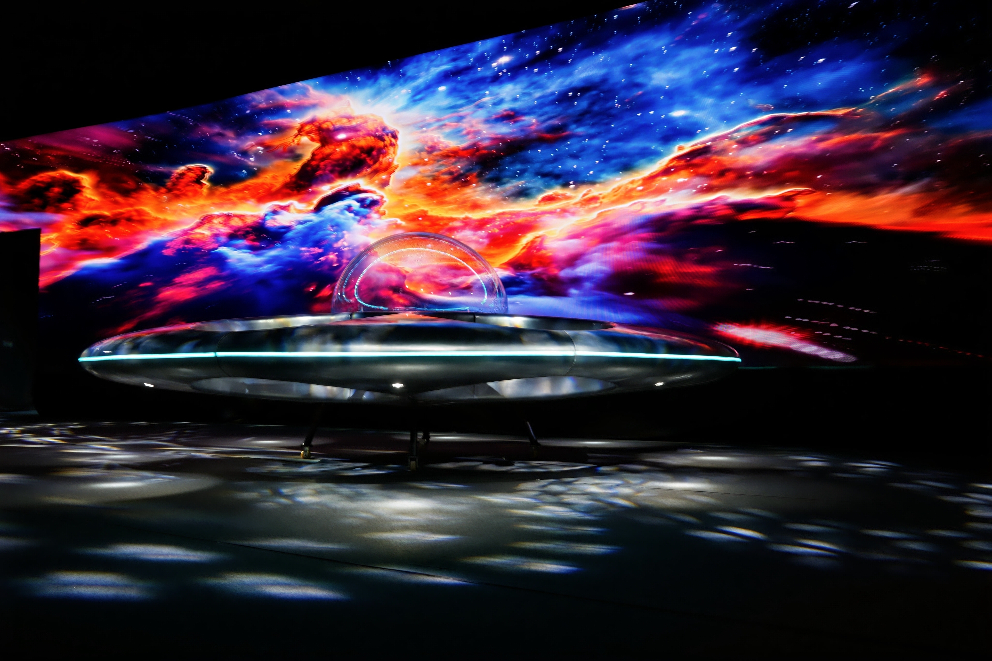 步入乐园大门,首先迎来的是探索意识与AI的“意识苍穹”。镇馆之宝——全球首款飞碟型纯电动垂直起降载人飞行器“智航iUFO”就在这里。该飞行器直径7米,由碳纤维复合材料制作机身,可模拟外星人“第一视角”的太空飞行体验。配合曲面大屏幕,仿佛进入宇宙世界,仰望星空,思考“意识”的本质。