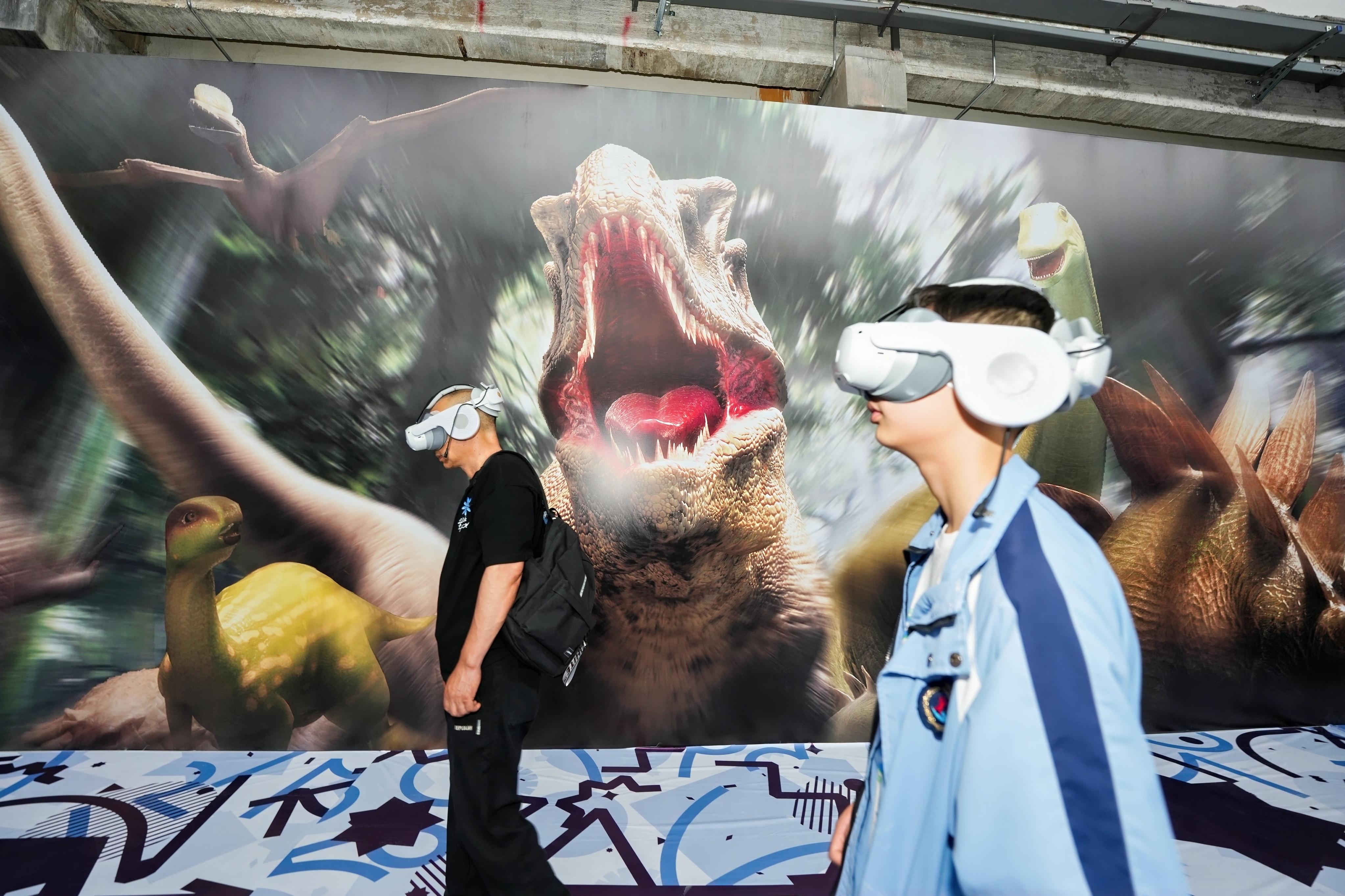 现场最火爆的要数“史前纪元”展区。在这里戴上VR设备就能进入“消失的侏罗纪”,跟随古生物学家李娜博士一同踏上史前探索之旅。近半小时的历险中,你会不由得跟着剧情在场地里走动,在远古时期的河里漂流、在万丈高空上过独木桥、骑在龙背上飞行……除了有温情的奇遇,还会有惊险刺激的时刻。