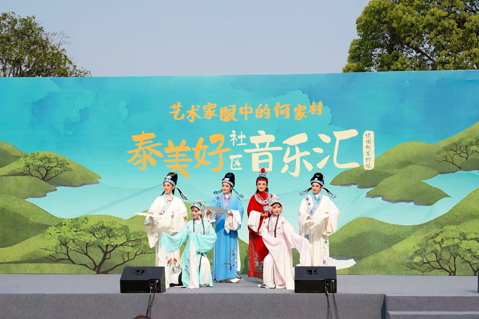 “左采茶来右采茶,双手两面一齐下……”伴随着《采茶舞曲》悠扬的旋律,“社区音乐汇@杭州何家村站”公益音乐现场秀在何家村茶园大草坪上演。露天舞台与茶田暮色相映成趣,浙江音乐学院师生组成的“文艺轻骑兵”和当地村民共同登台,为观众带来了民乐、舞蹈、戏剧等精彩节目。这场“没有边界的演出”让艺术从剧场舞台走向广袤天地,为美丽乡村赋予鲜活的艺术魅力。
