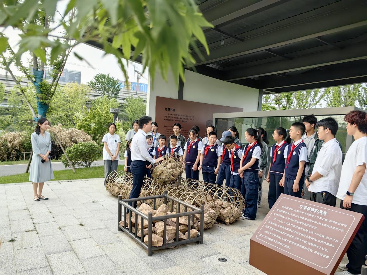 春假期间,当全国各大城市、热门景点被杭州学生“占领”之际,4月29日下午,杭州科技职业技术学院、富阳银湖中学、富春第六小学、富春第七小学的学生们,大手拉小手,携手走进家乡的中国江南水乡文化博物馆、临平古海塘文化公园,共同参与了一堂“行走的思政课”。