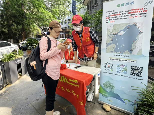 5月1日上午9点,南山路已是车水马龙。清波街道在此密集设置了3个旅游咨询服务点,志愿者楼浩然正忙碌地为游客指路。这位来自公益组织“杭小二”的大四学生,对周边停车场、公厕、游船码头的位置如数家珍。“游客没想到的,我们得替他们想到。”楼浩然说。为了精准服务,他和同伴提前做足功课,甚至借助小程序实时更新信息,只为让每位游客少走“弯路”。