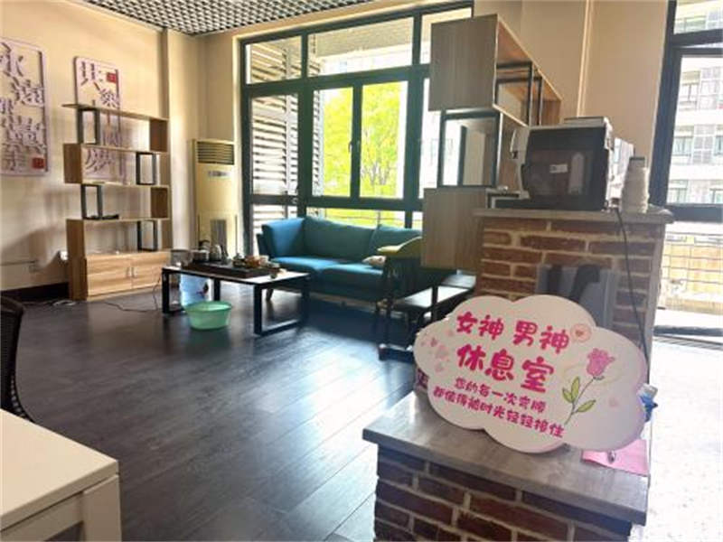 舒适的座椅、饮水机、储物柜等设施,保洁维修人员在内的所有劳动者都有了提供了温馨且有尊严的休息空间。
