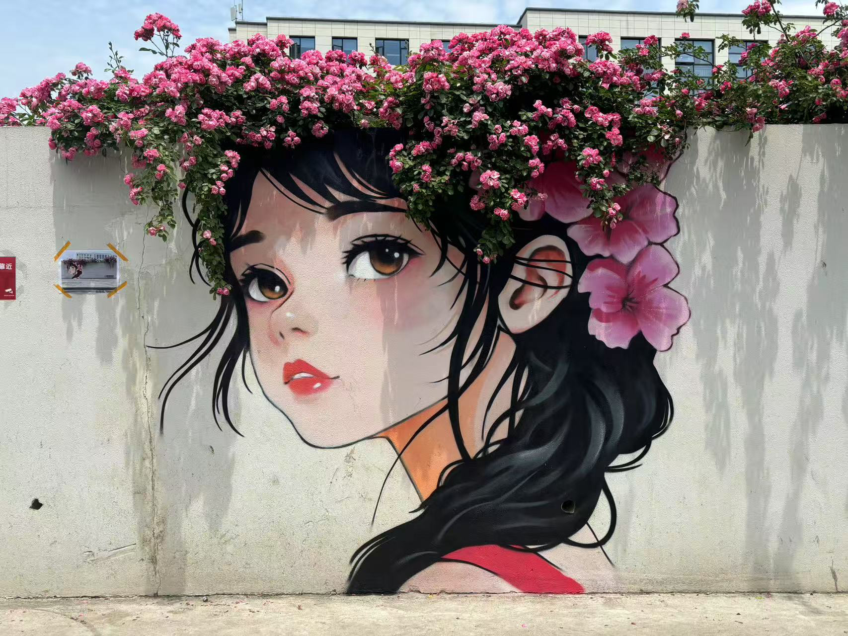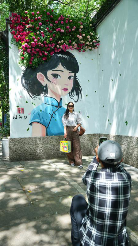 近日,路过清河坊街区的行人会发现,在惠民路和南宋御街交叉口,添了一抹别样的春日新景——墙绘作品《花香》,画中的少女穿着青蓝色的旗袍,发梢化作倾泻的月季瀑布,回眸一笑间眼底尽是灵动的盎然春意,吸引路人纷纷驻足打卡。