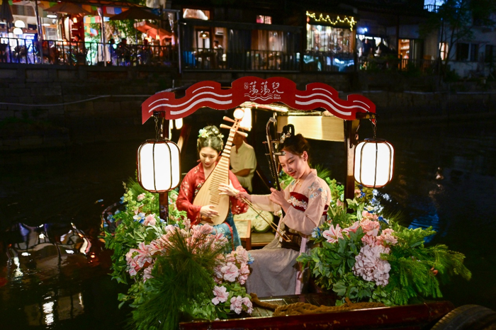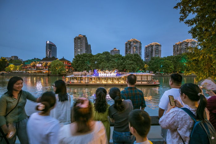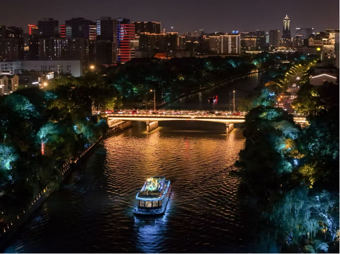 夜幕降临,两条特色游船同步启航。交响乐游船从拱宸桥西历史文化街区出发,甲板上阵容齐整的交响乐团奏响经典曲目《同一首歌》与杭州本土风情的《采茶舞曲》。游船途经小河公园油罐艺术区、香积寺古埠等地标时,两岸灯光随乐点亮,百年建筑在旋律中焕发新彩,引得岸边游客齐声合唱。另一条民乐游船则从小河直街启程,汉服乐师立于船头,指尖流淌出《风居住的街道》等悠扬曲调,与酱园码头、惠安桥的古韵景致相映成趣,游客纷纷驻足拍照,记录“琴声伴流水”的诗意瞬间。