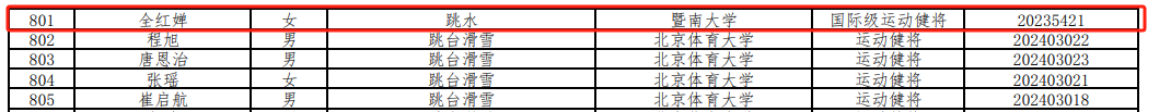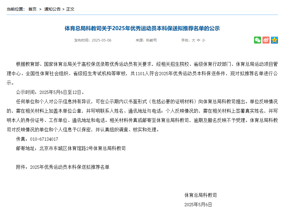 5月6日,国家体育总局科教司官网发布体育总局科教司关于2025年优秀运动员本科保送拟推荐名单的公示。共1101人符合2025年优秀运动员本科保送条件,其中包括多位巴黎奥运会冠军,全红婵拟保送暨南大学,盛李豪拟保送北京体育大学,黄雨婷拟保送浙江大学,李雯雯拟保送厦门大学。