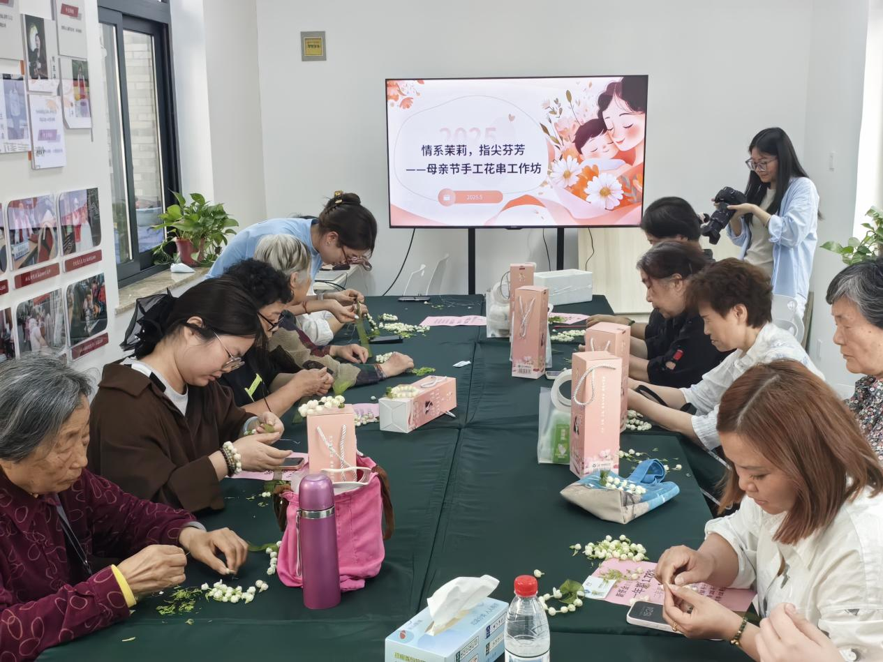活动当天,活动室被布置得温馨雅致,茉莉花的清香弥漫全场,桌上摆放着精心准备的茉莉花苞、水晶珠串、丝线等材料。活动伊始,辖区一所学校的老师向居民们讲解茉莉花的文化寓意:“茉莉谐音‘莫离’,象征纯洁与永恒的爱,自古以来便是表达亲情的佳品。”随后,她细致演示了茉莉手串的编织技巧,从花苞固定、珠串搭配到绳结收尾,每个步骤都融入了对母亲的美好祝愿。