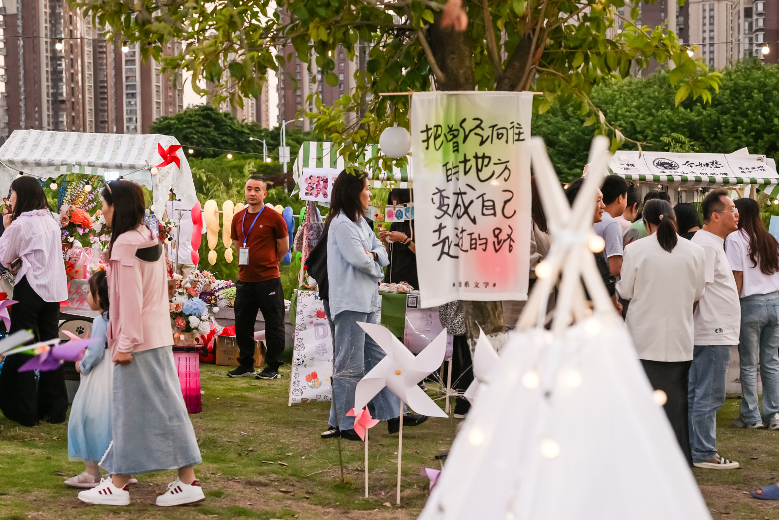 草地上布置着白色帐篷和躺椅 。树木间缠绕着暖黄色小灯串。白色风车随风转动。现场,市民或漫步闲逛,或驻足交流,呈现出热闹又放松的生活烟火气。