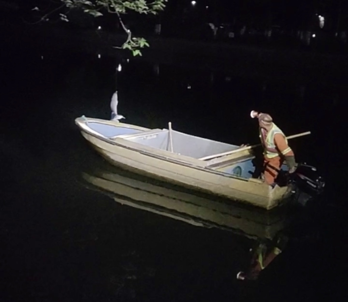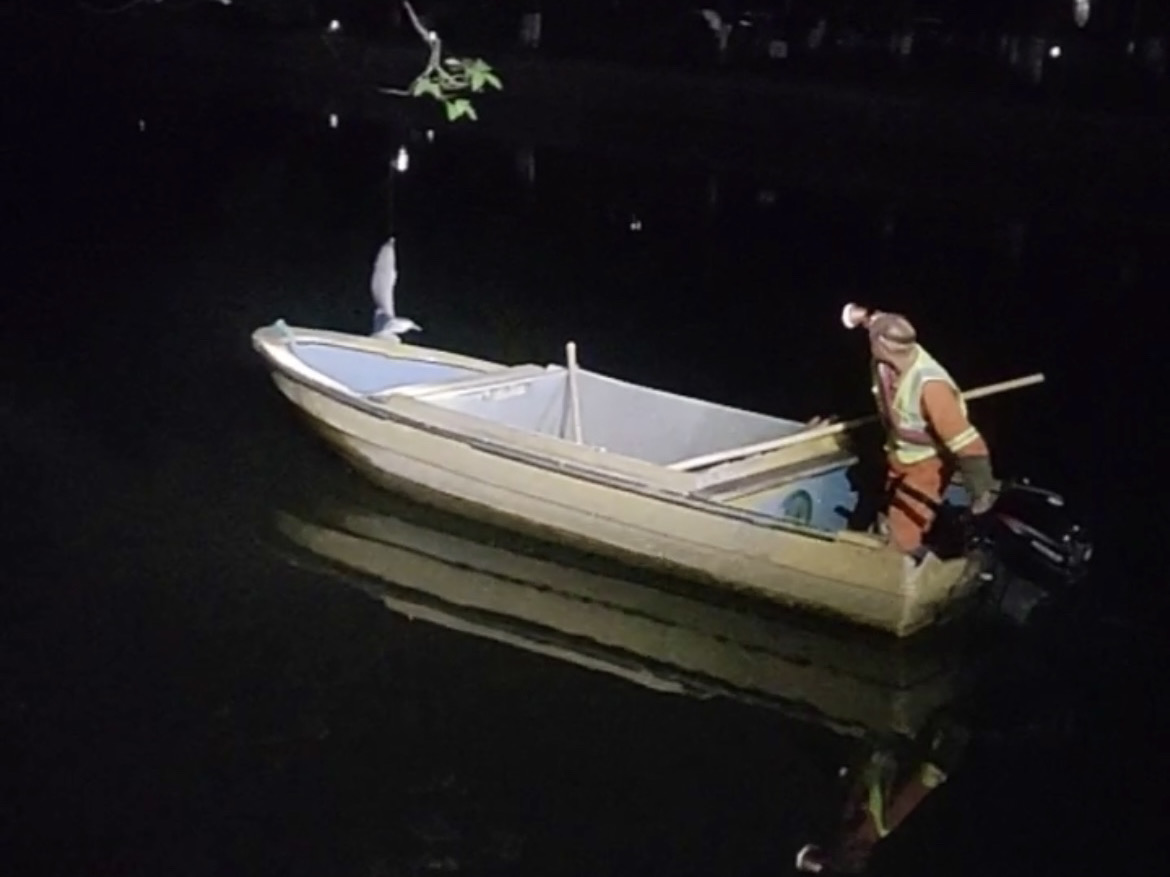 接到求助后,杭州城管部门迅速响应,市管河道养护人员驾驶救援船只,携带专业工具,火速赶赴现场。夜色中,救援人员打开照明灯,锁定受困白鹭的位置,小心翼翼地用网兜靠近,将其稳稳救下。随后,养护人员对白鹭进行了初步检查,确认其并无明显外伤,健康状况良好。