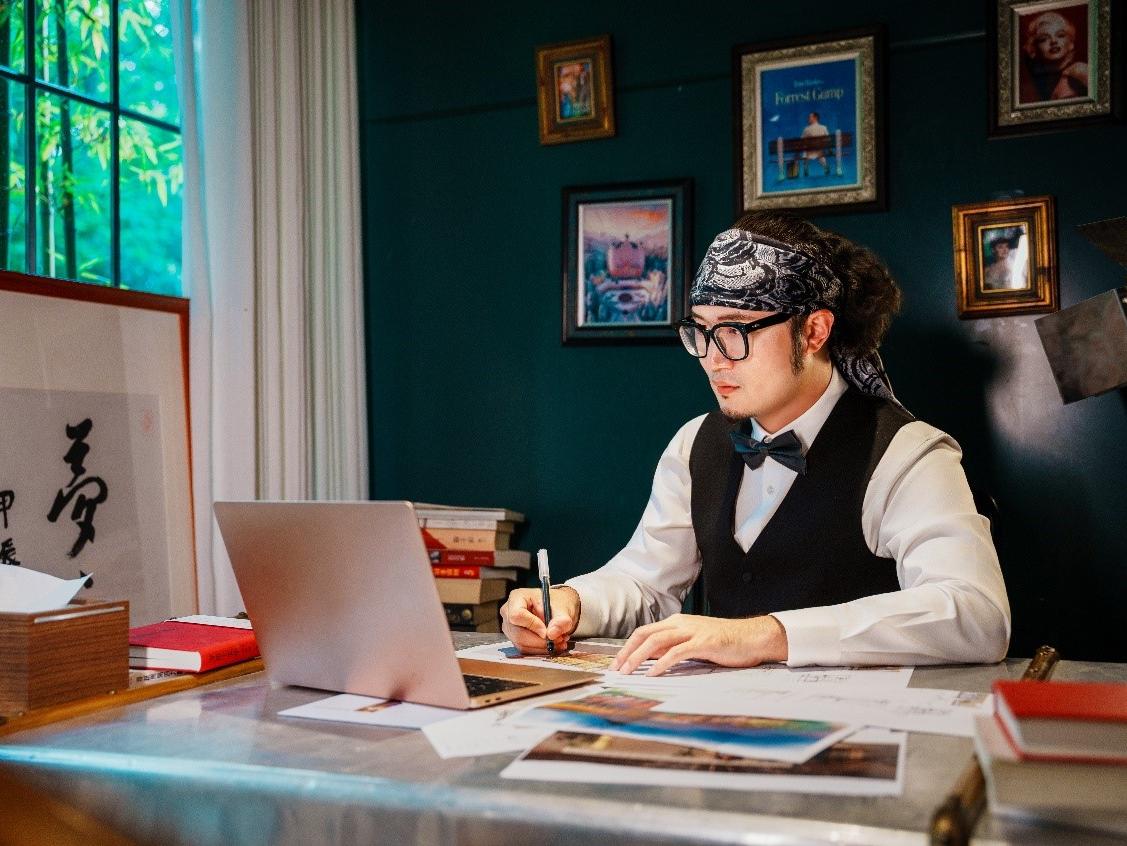 在接受本网专访前,创始人何岩正进行商务洽谈。他的办公室不大,却细节满满:墙上挂满电影海报,办公桌上散落着分镜脚本和设计图纸,角落里陈列着历史书籍与电影道具,旁边还立着四个大字“梦之柏庐”。这间办公室不仅是他的“造梦工坊”,更承载着一段关于历史、艺术与商业碰撞的故事。