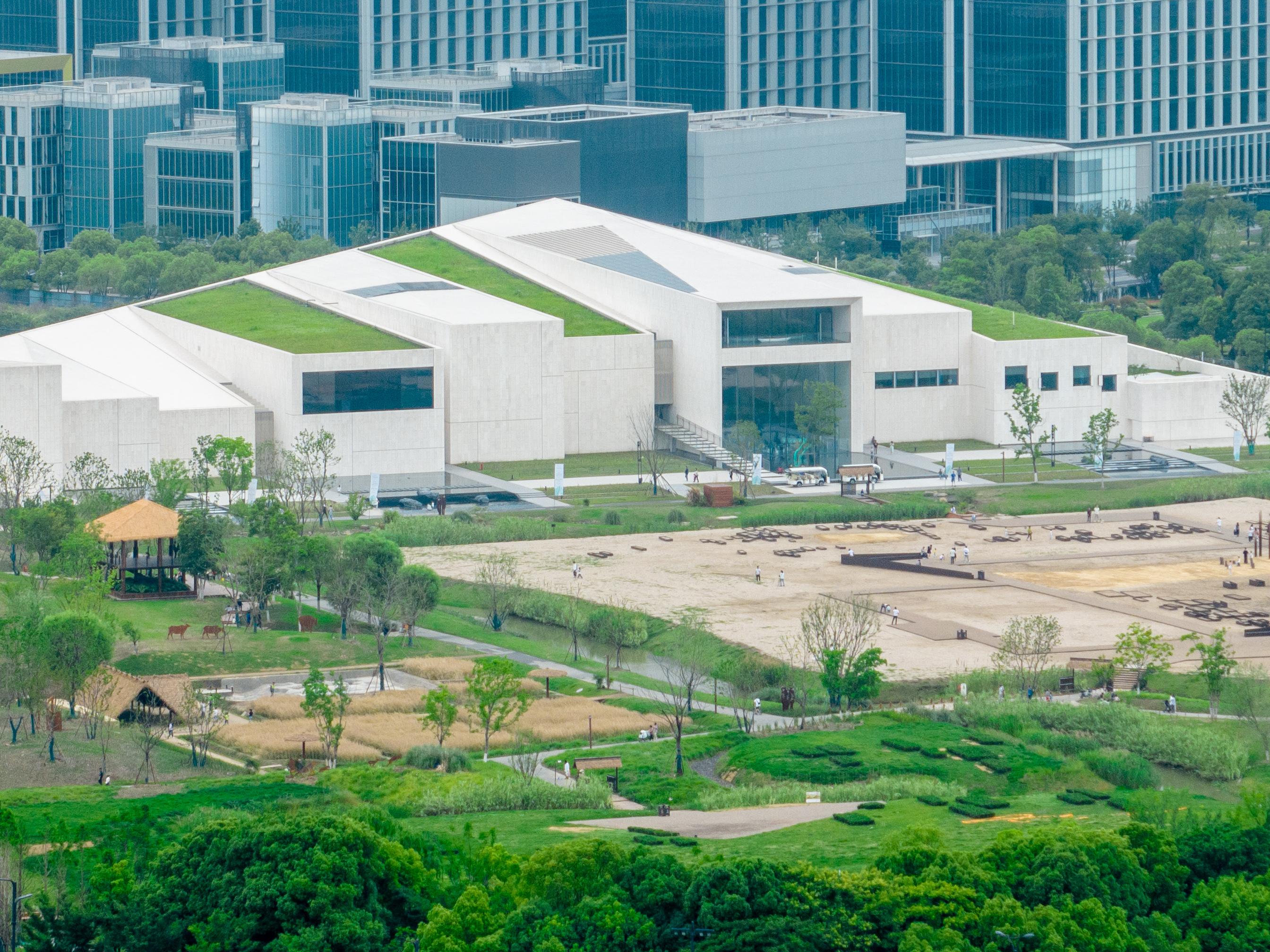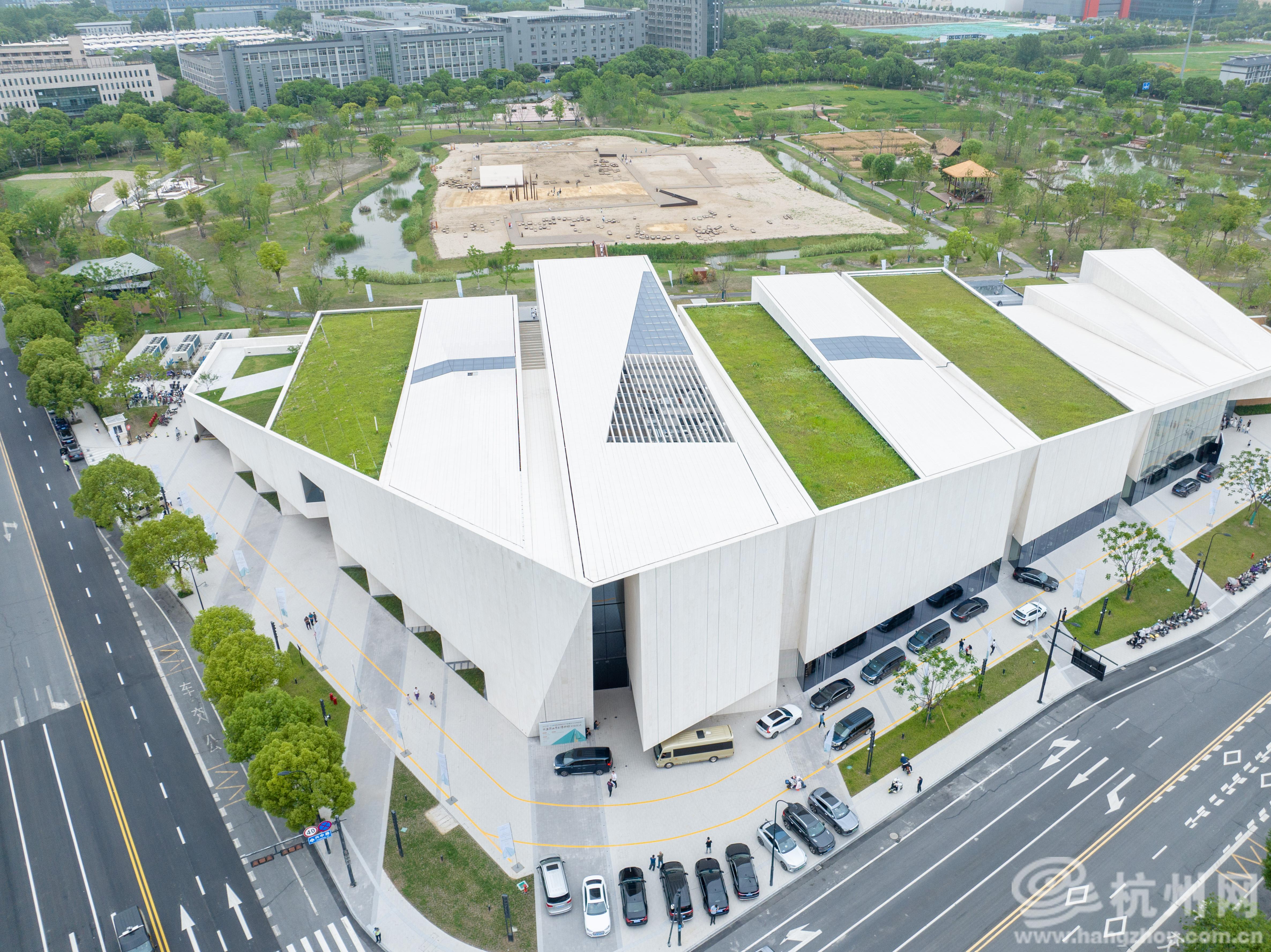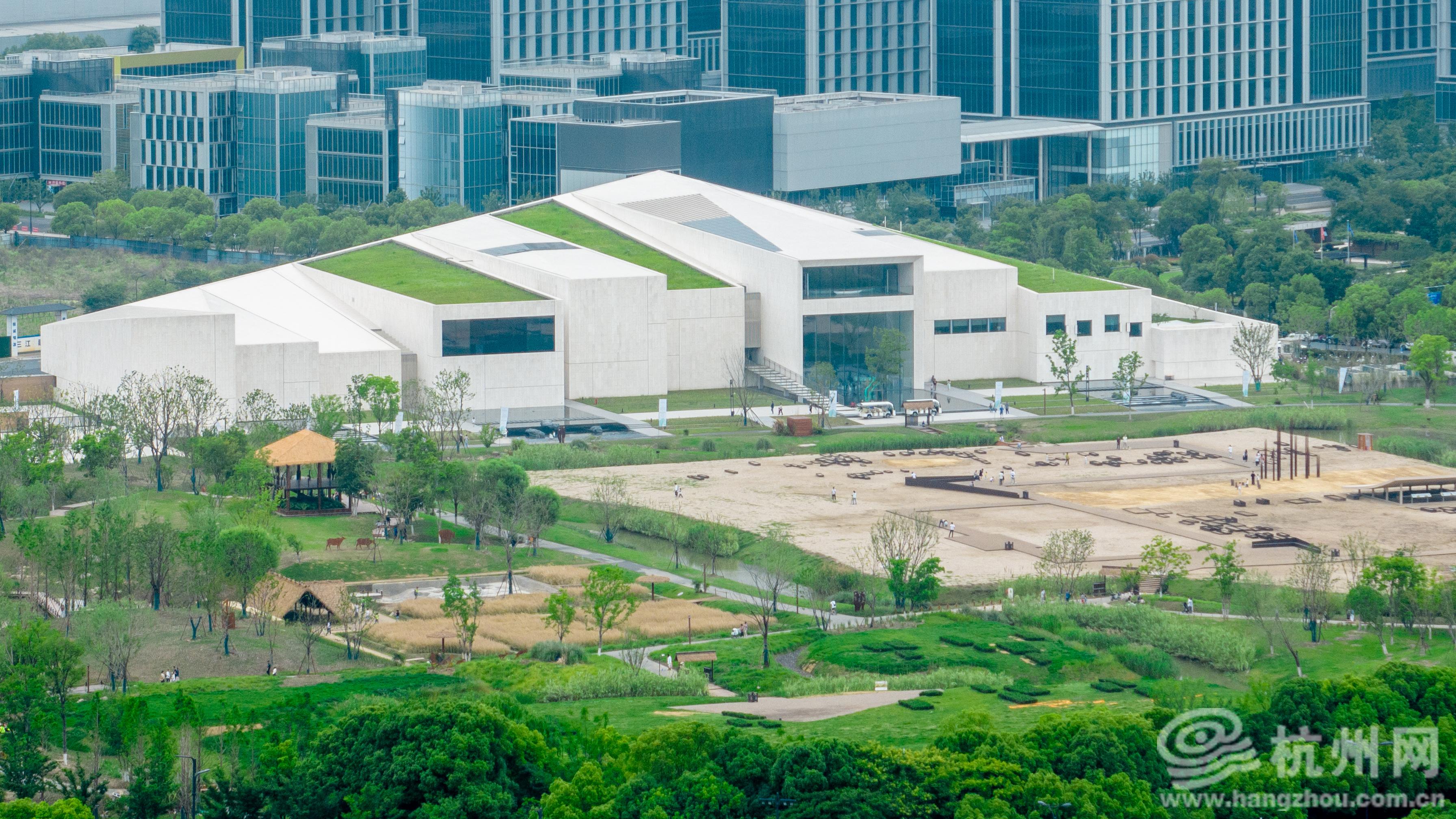 建筑设计理念“以玉为媒,间架为山”,南高北低的倾斜体量呼应玉架山之名,外立面质感如良渚玉器般温润。