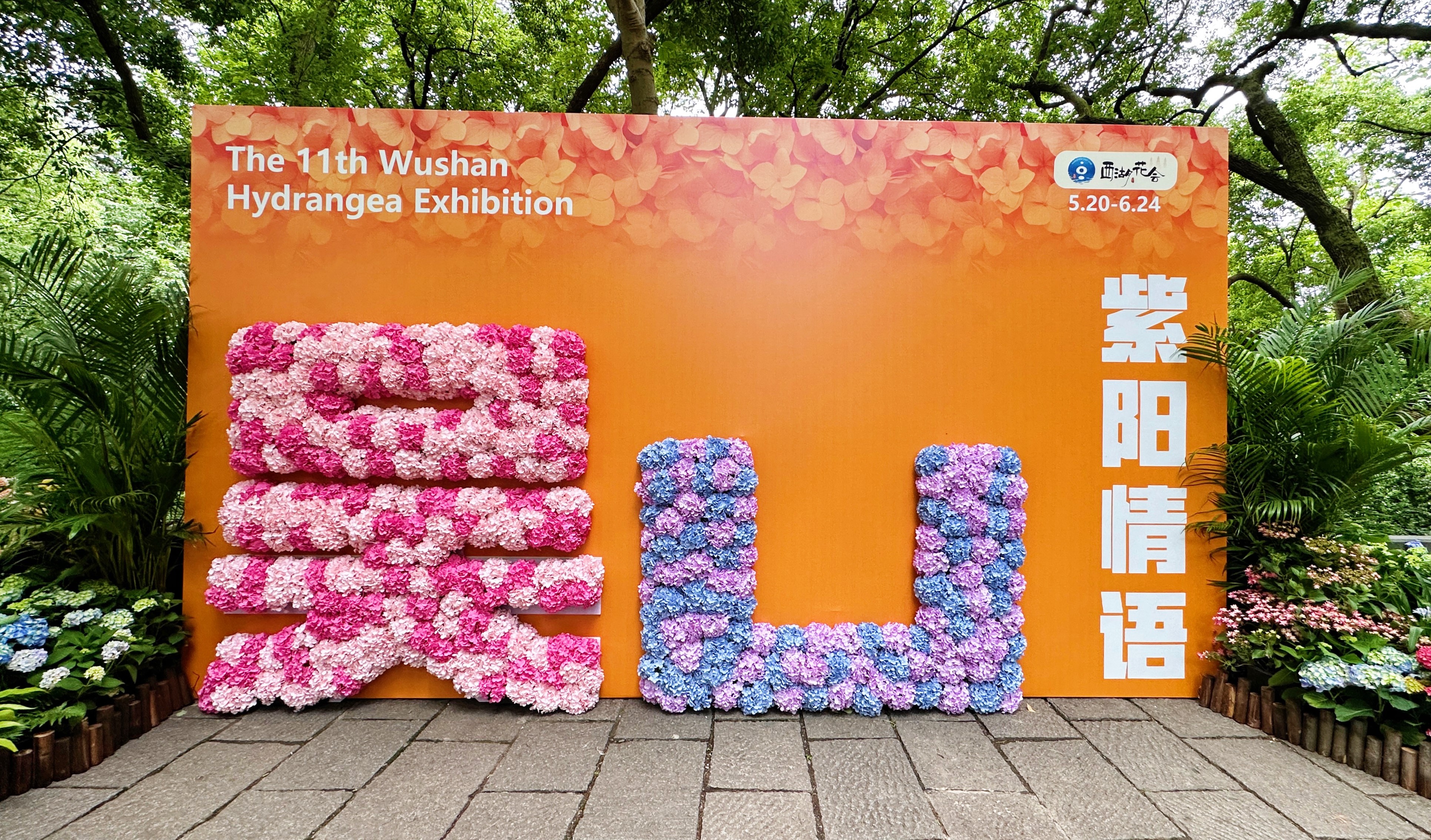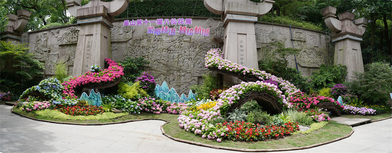 高达3米的立体花墙,以八仙花为“墨”,书写“吴山”二字。艺术家巧妙留白最后一竖,邀请您走进画中,以身影补全这幅流动的山水长卷。