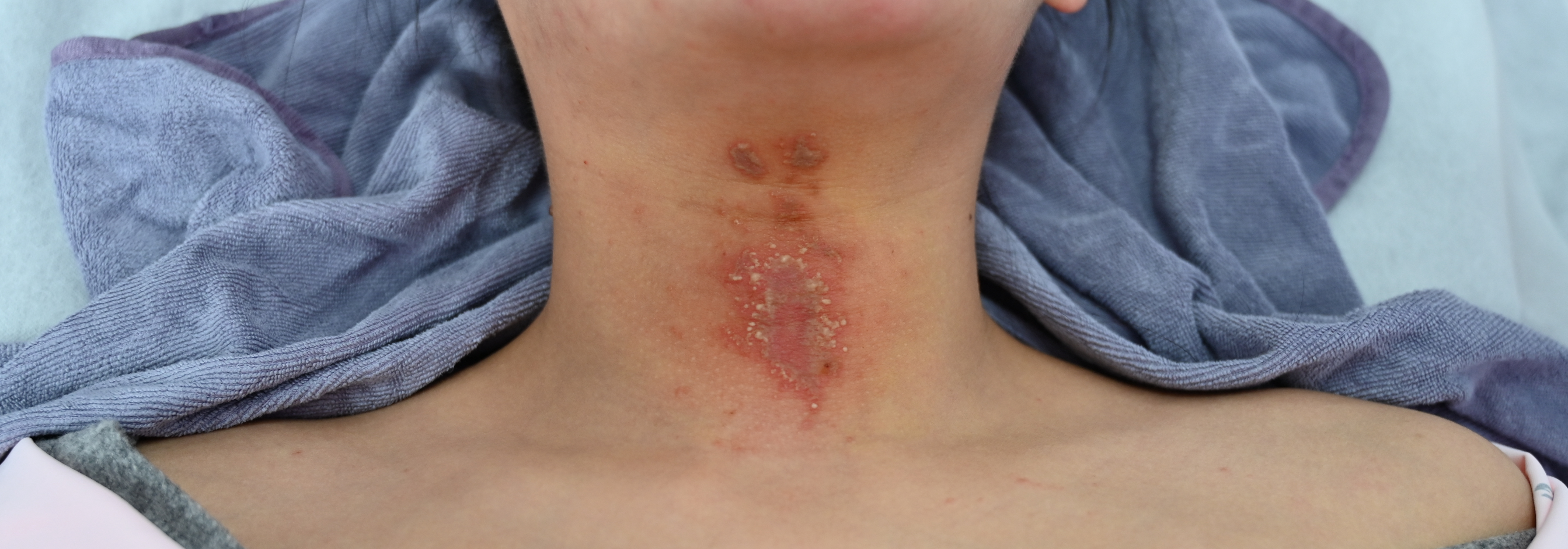 “我这皮肤会留疤吗,还能恢复得和原来一样吗?”在浙江省皮肤病医院护理室里,30岁的小妍(化名)一边拿着镜子观察脖子上成片的丘疹和水疱,一边向护理人员发出了“灵魂追问”。