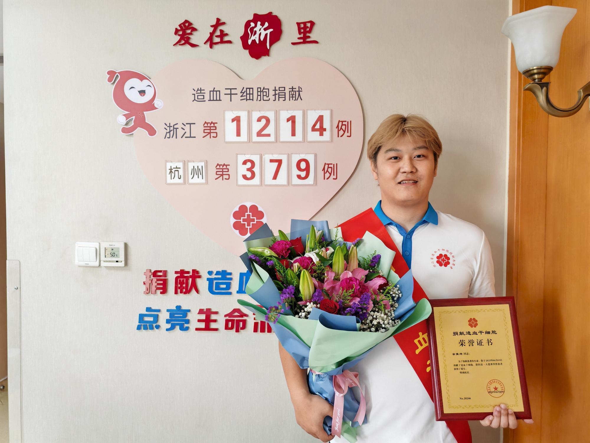 6月3日,经过6个小时的采集,余宸炜完成329毫升造血干细胞悬浮液的采集。至此,余宸炜有了一个新身份—浙江省第1214例、杭州市第379例造血干细胞捐献者。