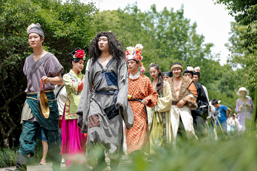 活动中,来自杭州汉服协会的百名爱好者身着宋制褙子、明制马面裙,沿丁丙纪念馆、陈元赟纪念馆、林下书院等文保建筑巡游;游客沉浸式体验“林公子的酒摊”古法酿酒,带着小朋友体验非遗漆扇制作和包粽子,打卡游船、投壶、蹴鞠等传统游戏。