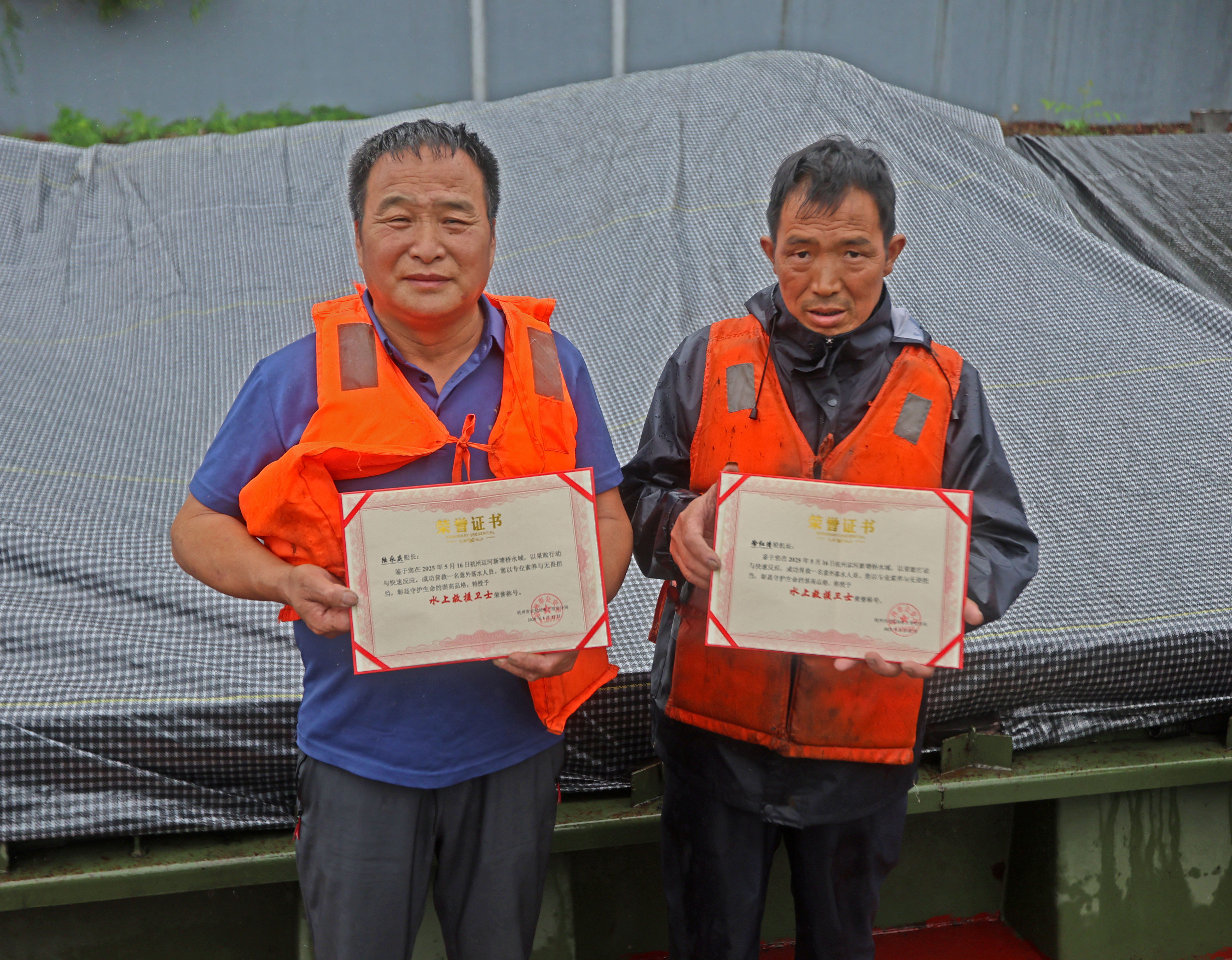 “鉴于您在2025年5月16日杭州运河新塘桥水域,以果敢行动与快速反应,成功营救一名意外落水人员。您以专业素养与无畏担当,彰显守护生命的崇高品格,特授予‘水上救援卫士’荣誉称号。”两人接过大红证书,开心不已。船长陆永庆有点不好意思,轮机长徐红清的手则有点颤抖。