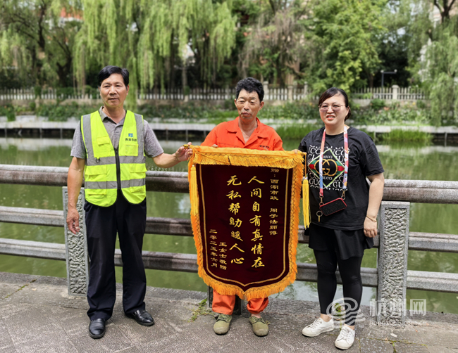 “真的太感谢了!周师傅帮了我大忙了!”6月20日一大早,市民王女士特地赶到莲花港河丰潭公园旁,给她口中的周师傅送锦旗,锦旗上写着“人间自有真情在,无私帮助暖人心”。