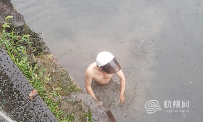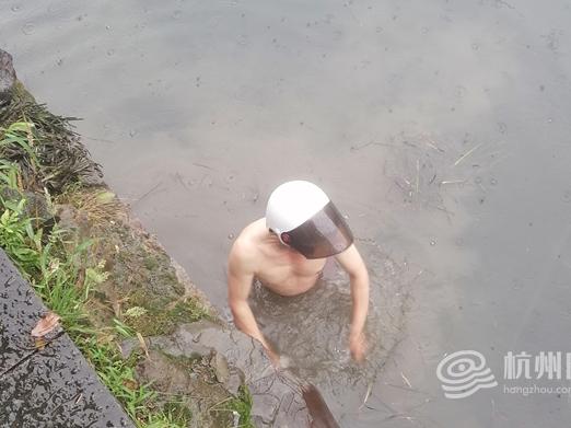 当天因为下大雨,河道水位有点深了,周师傅跟沈师傅商量,周师傅负责下水捞眼镜,沈师傅河边指挥和保障周师傅的安全。分配完任务,怕流水带走眼镜,周师傅连头上的电动车头盔都没顾上摘就下水了,来来回回摸索了半个多小时才找到“目标”,小心翼翼地交到王女士手上。