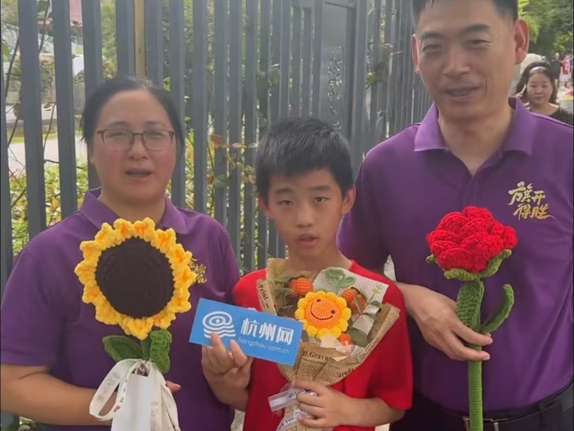 相比这朵小葵花,吴先生带的葵花就“显眼包”了。他身旁的向日葵比人都高,格外醒目。花枝上,“金榜题名”的祝福卡随风轻摆。“今天是孩子中考,也是他人生重要的转折点。”