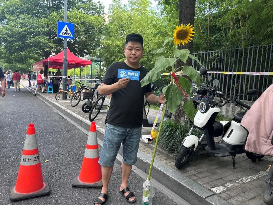 在杭州观成实验学校考点,手持一人高向日葵的吴同学爸爸特别显眼。他告诉记者,这株向日葵是早上准备的,特意挂上了“金榜题名”祝福卡,期望孩子中考稳定发挥,一举夺魁。