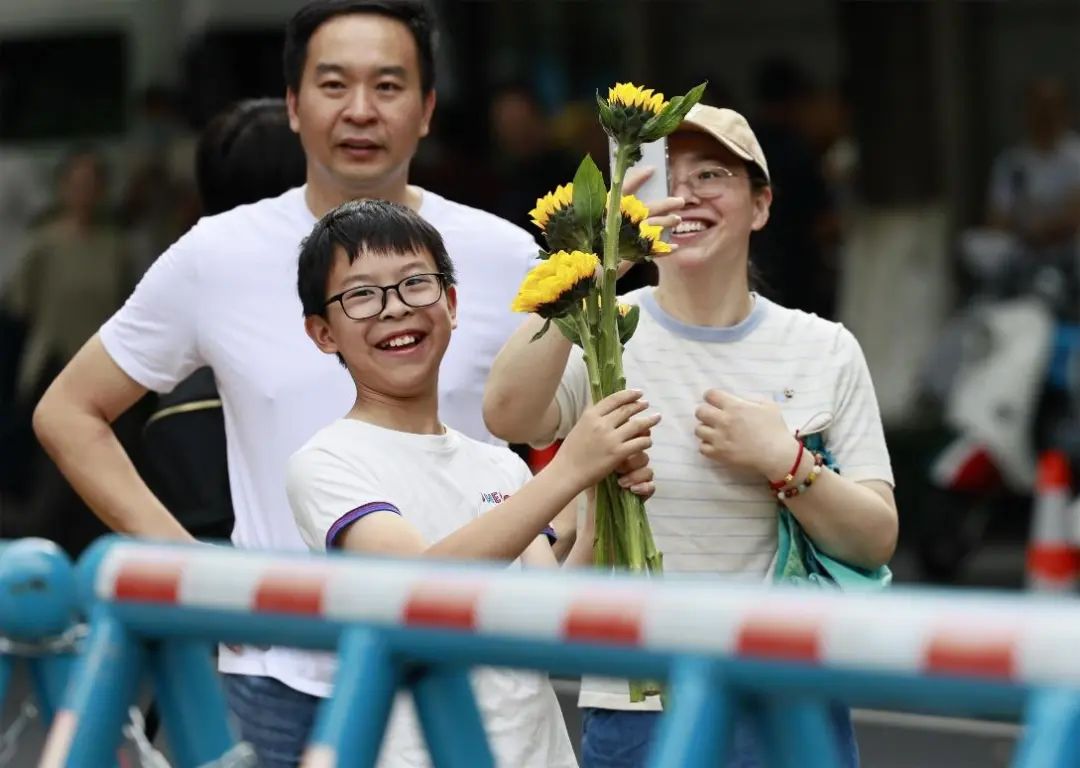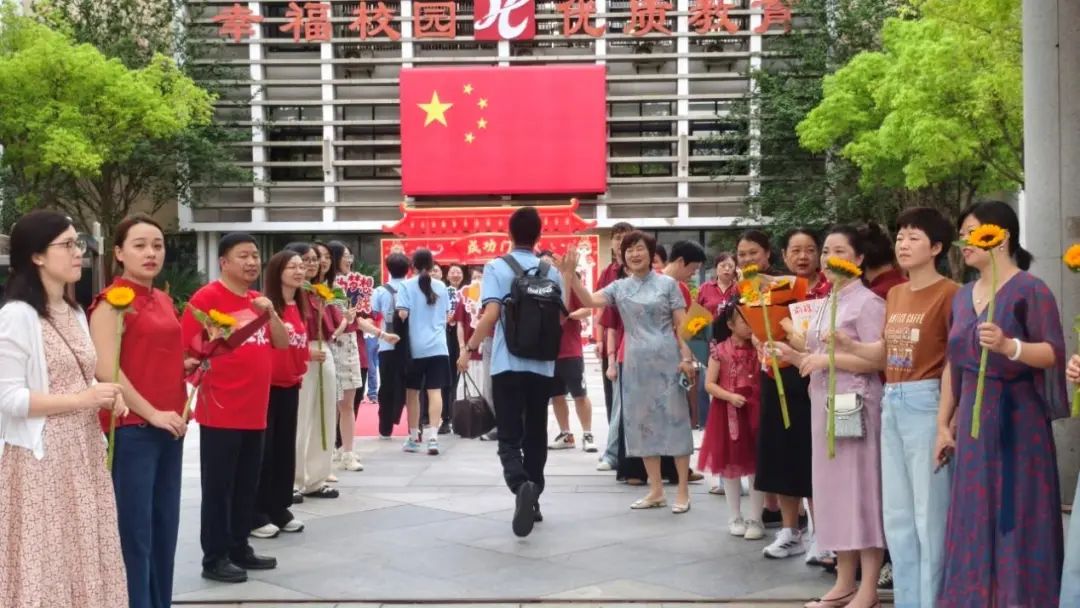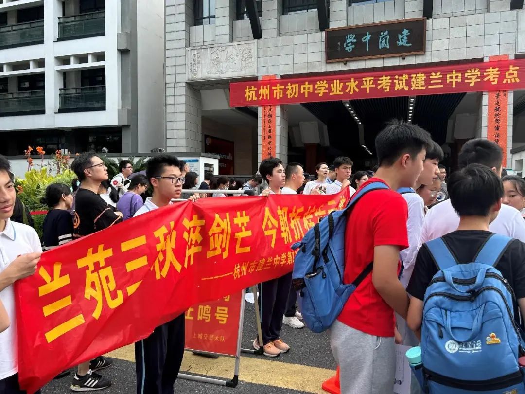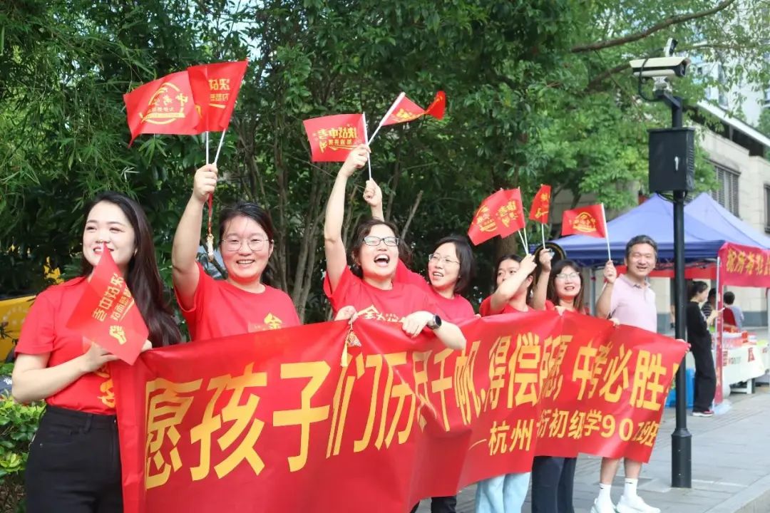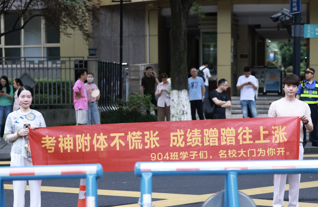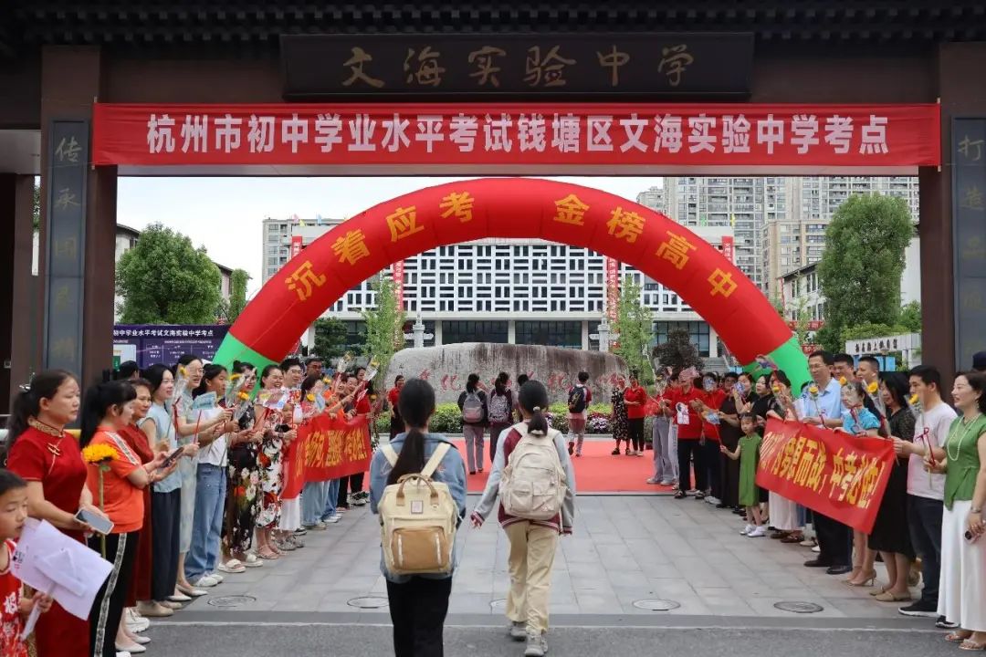 在杭州市夏衍初级中学考点,送考家长和老师带上满满的祝福:愿夏初考生们如骄阳恣意,抵心之所期!