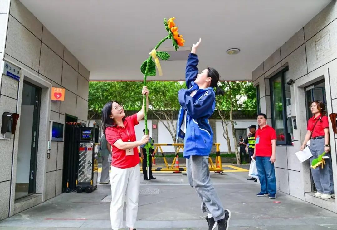 杭州市安吉路实验学校考点,老师们手持针织向日葵为孩子们送考。
