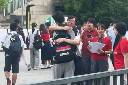 杭州观成教育集团初三年级组长陈雪梅和其他老师们在考场外跟孩子们击掌拥抱,她告诉记者,三年来老师们早就把这些孩子们当成了自己的孩子,希望他们能沉着应对考试。