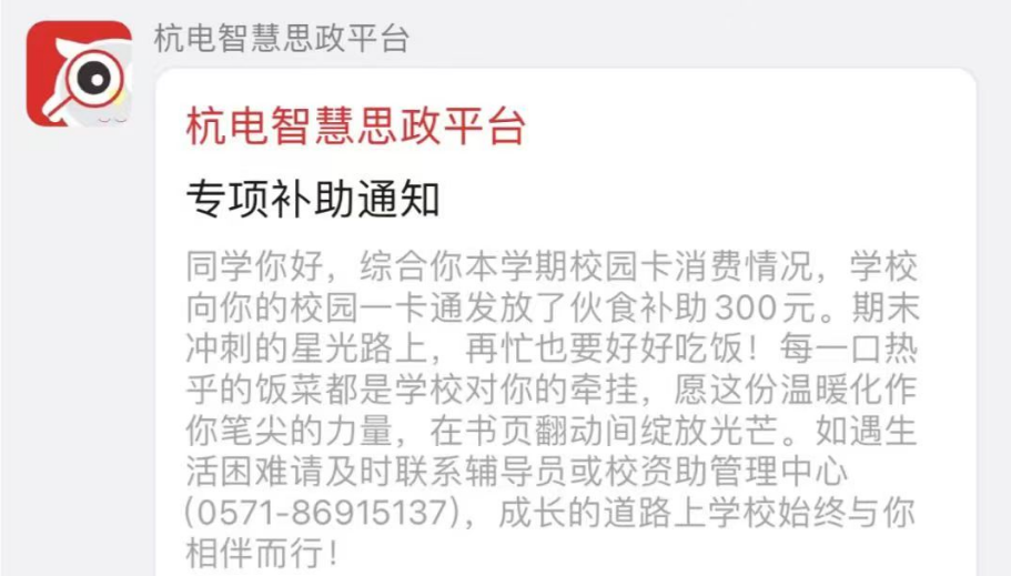 近日,杭州电子科技大学的校园里,135名同学收到了一份特殊的“安心礼包”——校园一卡通账户中悄然多出了一笔300元的伙食补助。这笔无需申请、不请自来的“隐形资助”,源自学校学生资助管理中心基于食堂消费大数据开展的精准帮扶行动。