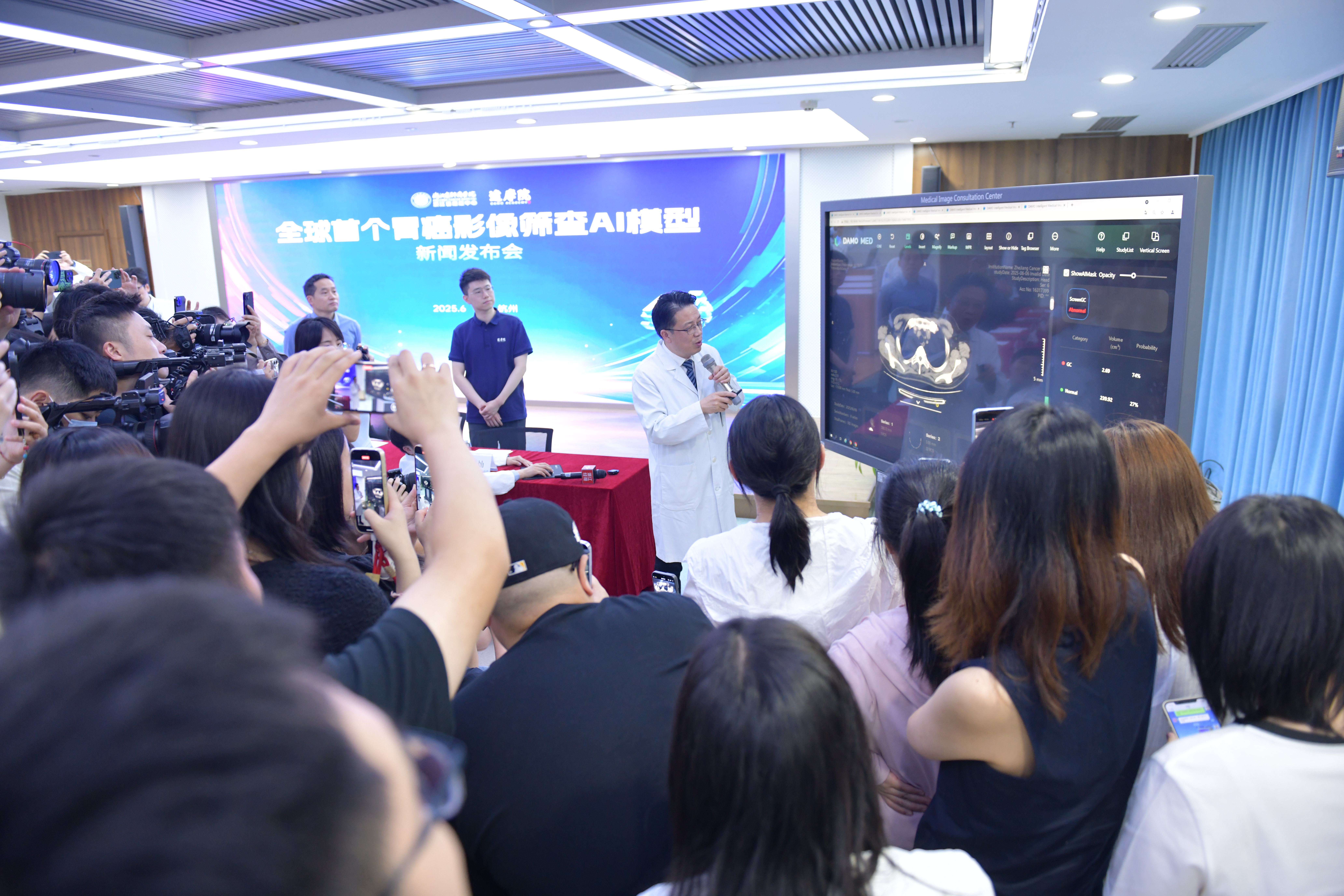 6月25日,浙江省肿瘤医院联合阿里巴巴达摩院召开发布会,发布全球首个胃癌影像筛查AI模型DAMO GRAPE,首次利用平扫CT影像识别早期胃癌病灶,并联合全国20个中心近10万人的大规模临床研究中大幅提升胃癌检出率。相关成果登上国际顶级期刊《自然·医学》(Nature Medicine)。