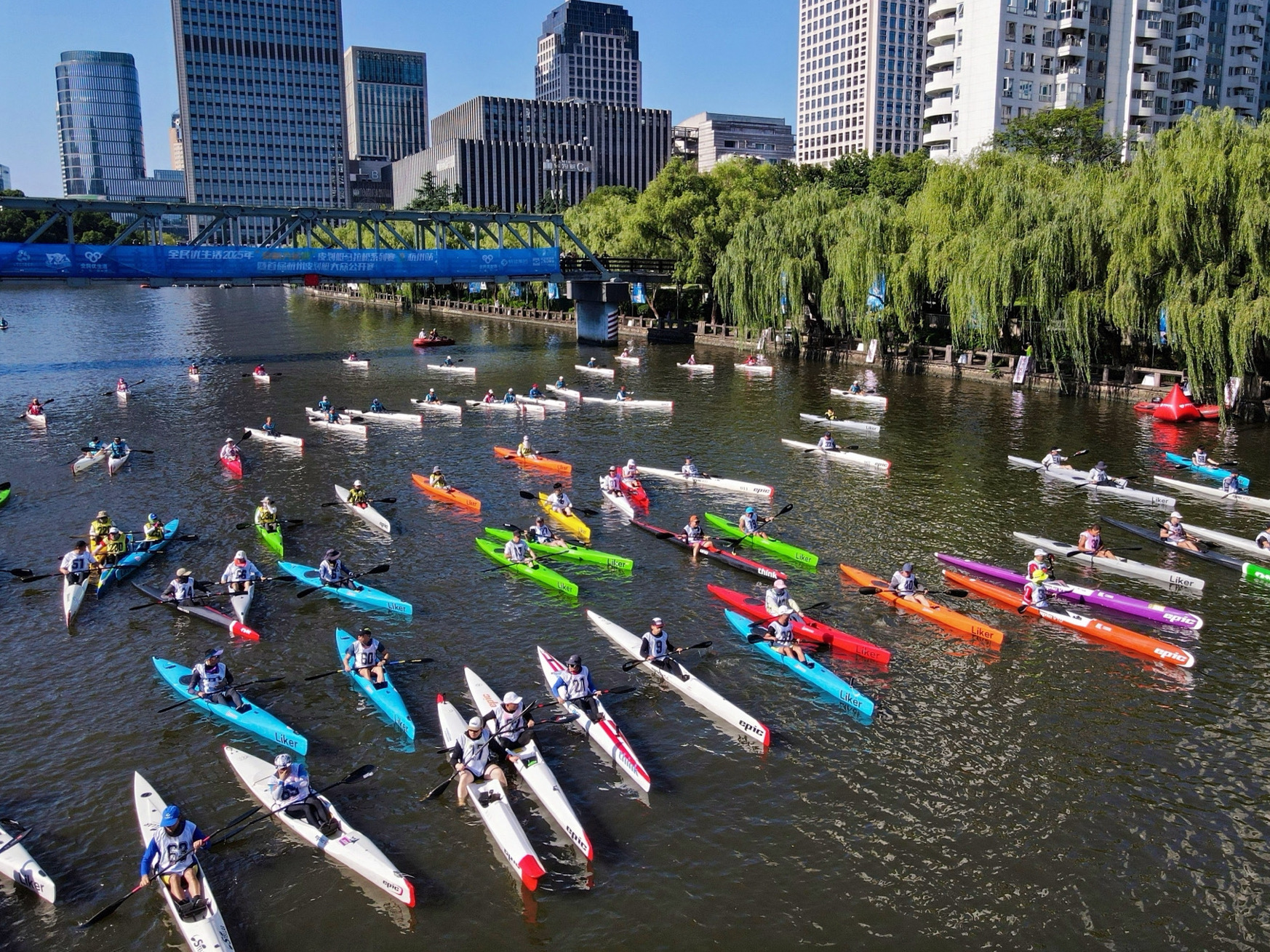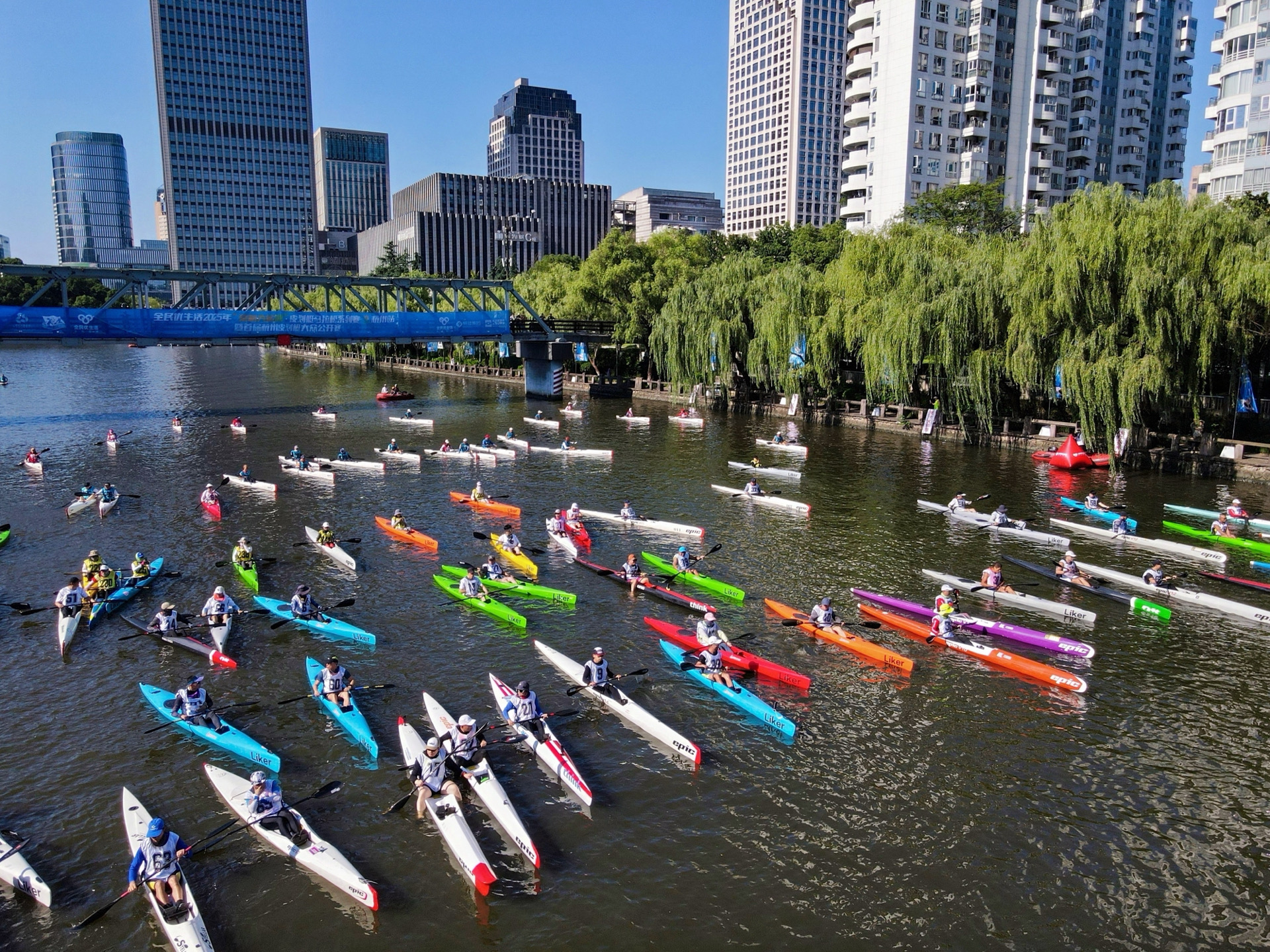 赛道起点设在西湖文化广场武林门码头沿岸水域,该水域堪称运河文化精华段,兼具自然生态、历史遗存与城市活力三重特质。沿途经过朝晖桥、潮王桥、霞湾桥、江涨桥、大关桥、登云桥,抵达拱宸桥后折返。劈波斩浪间,选手们仿佛置身“活的运河博物馆”,每一座桥都是一部历史书,短短5公里浓缩从南宋市舶司到清代海关的千年漕运史。