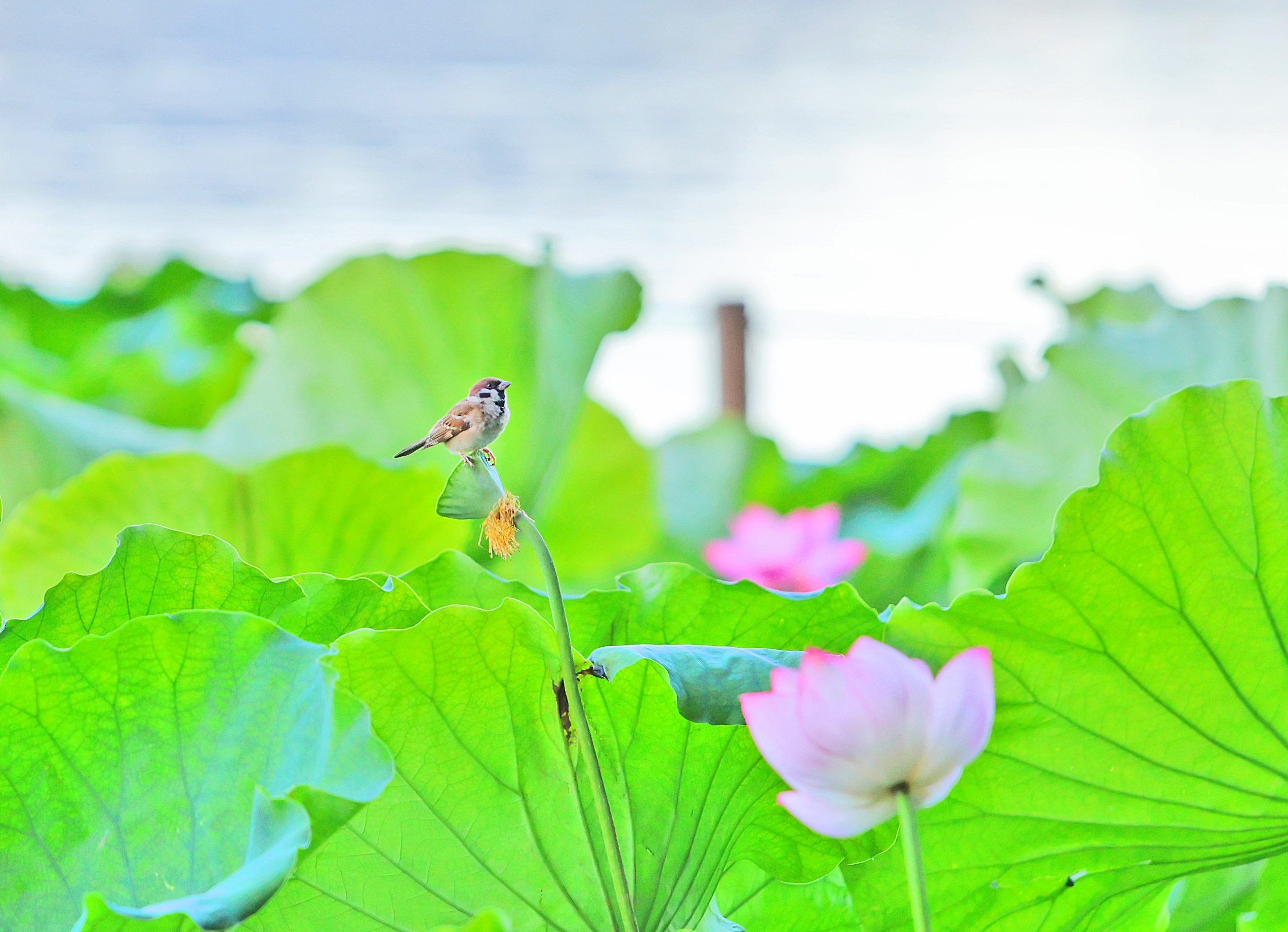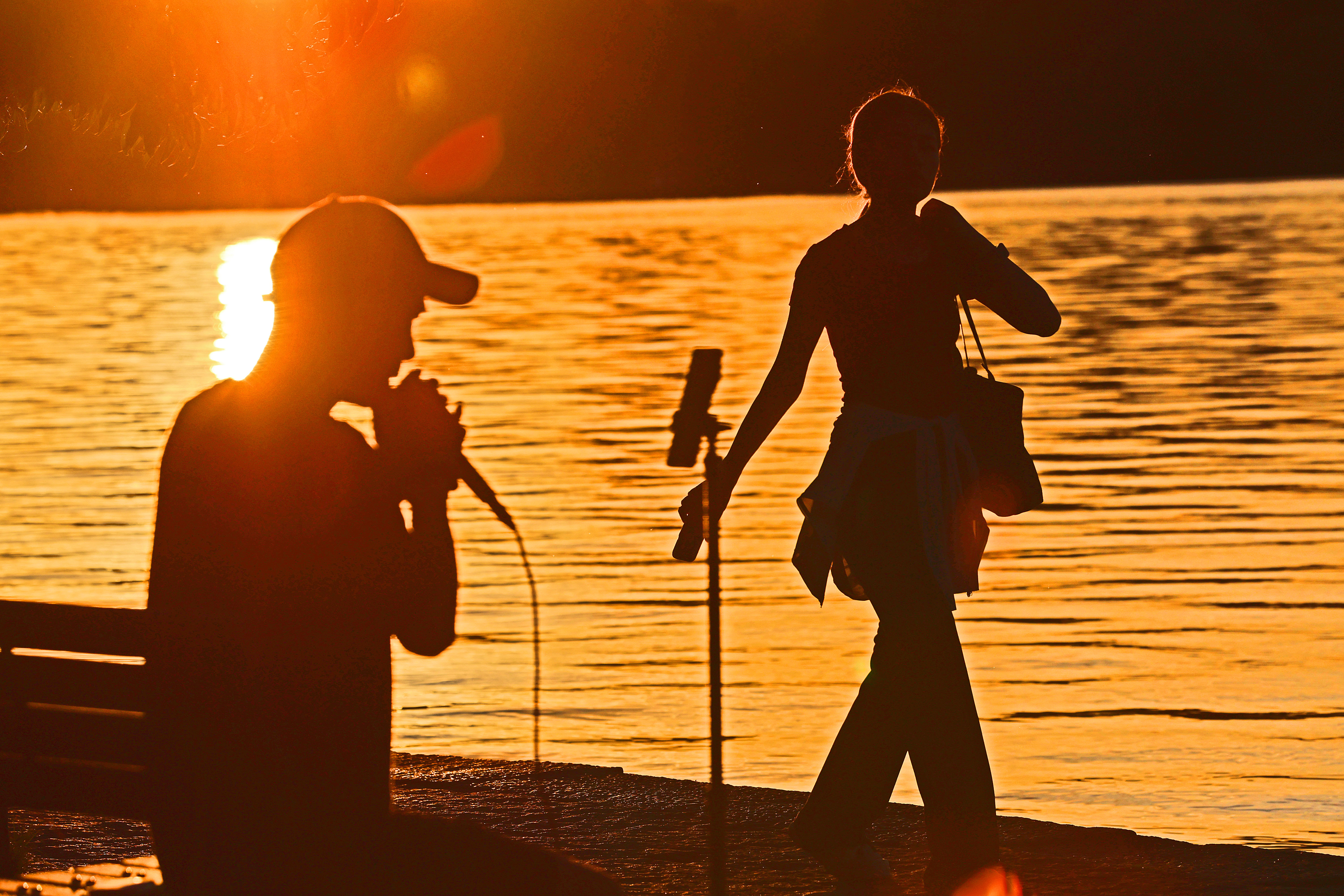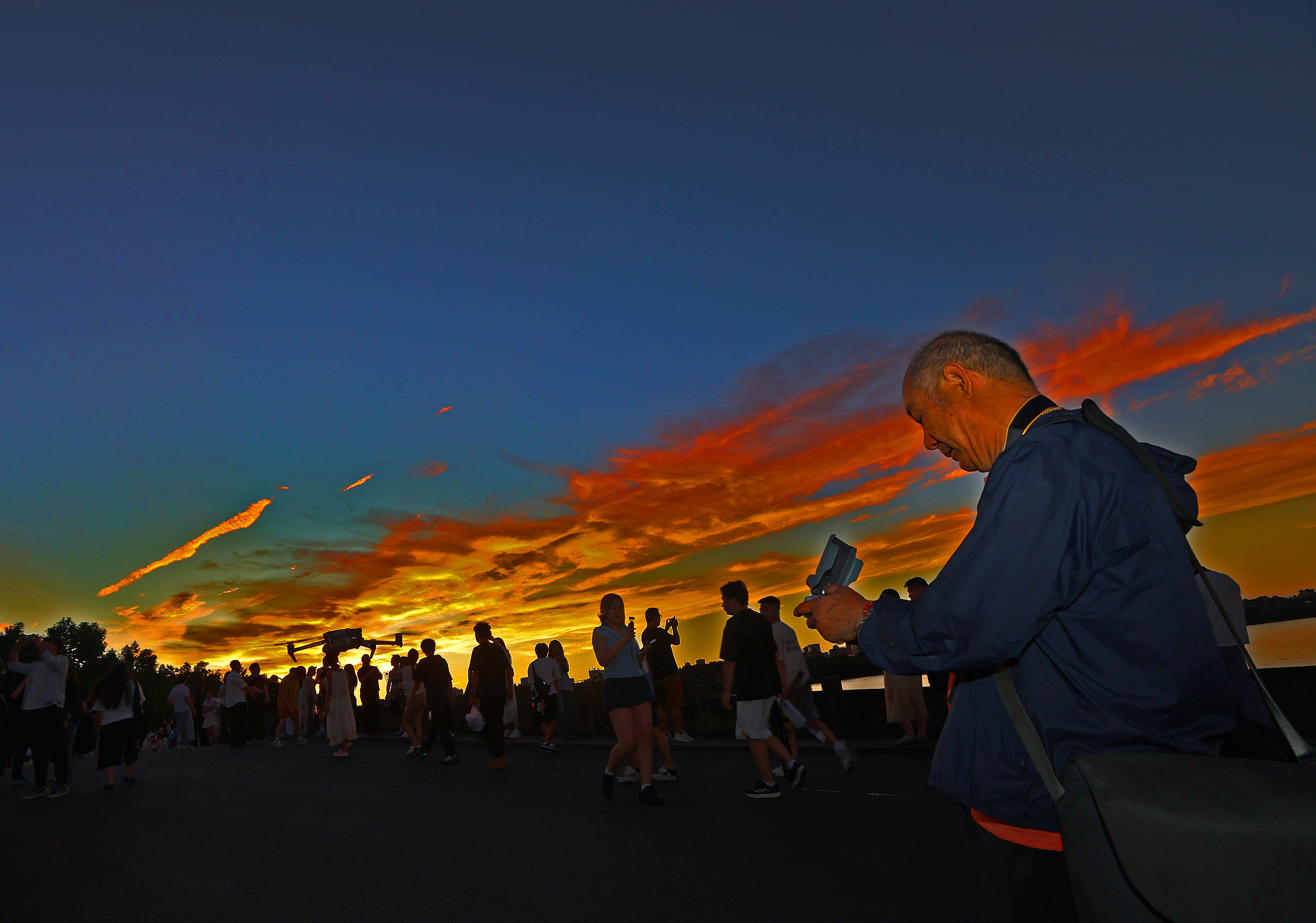 4点20分左右,断桥顶上的薄云泛红,众人手机齐刷刷向东,赞叹声此起彼伏,直播的人更是绞尽脑汁,不吝溢美之词。没多久,整个湖面开始变红,以至于逆光观湖,必须抬手低头帽檐遮光。立断桥回看,白堤瞬间变成了众人走秀拍照的时尚秀场T型台。白堤的纵深感加上两边垂柳装扮加持,使得大家的照片增色不少。镜头左右扫射,景色依旧堪称极致,一边一湖金,另一边,抬眼一山绿,垂目荷花艳。天虽没风,但也不热,不闷。人人喜气洋洋。
