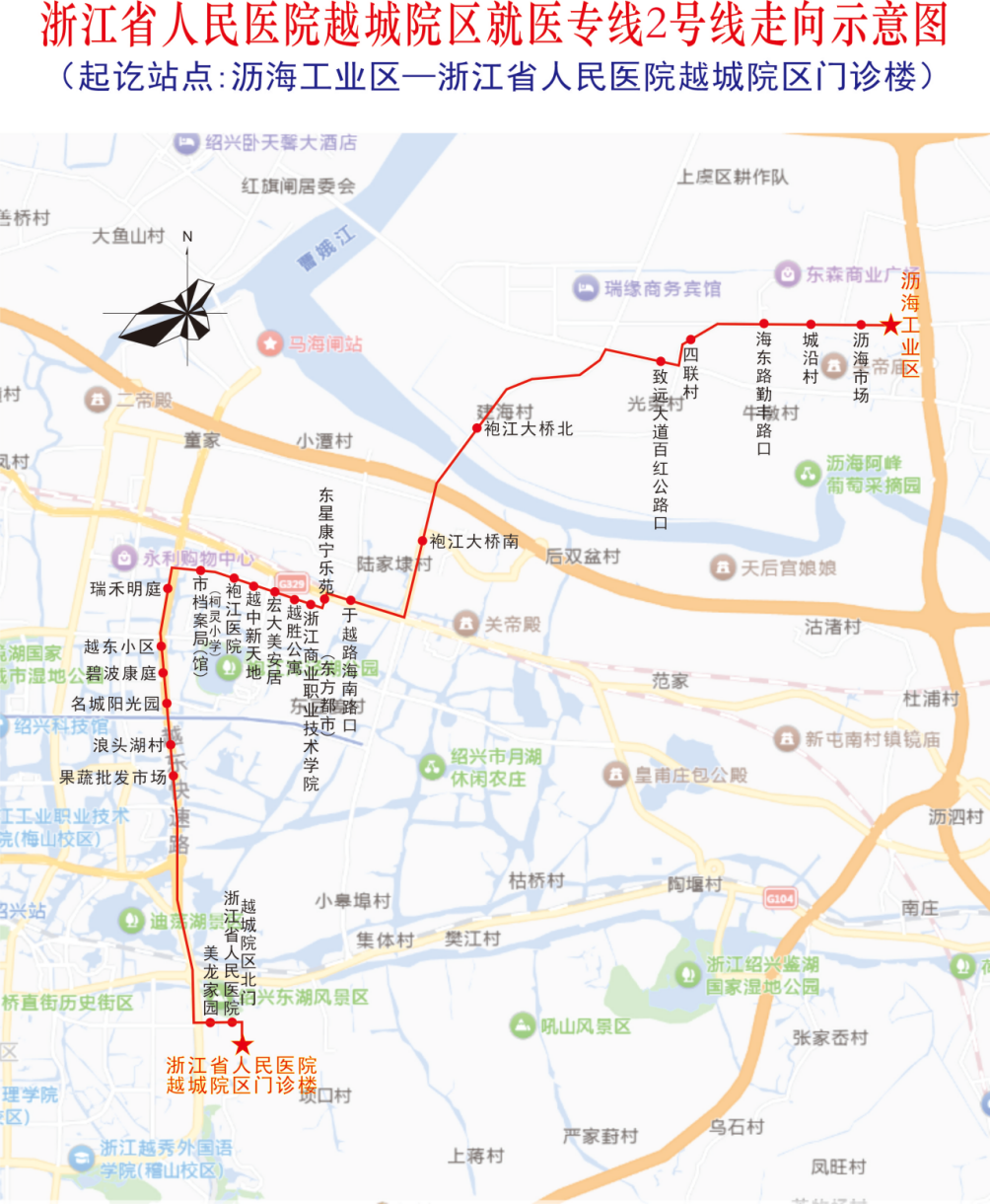 2号专线打通城北沥海袍江区域,全长30公里,途经24个站点,每日运行4趟次,首班车6:40从沥海工业区发车,末班车16:30从院区返回,为就医患者提供定时定点服务。