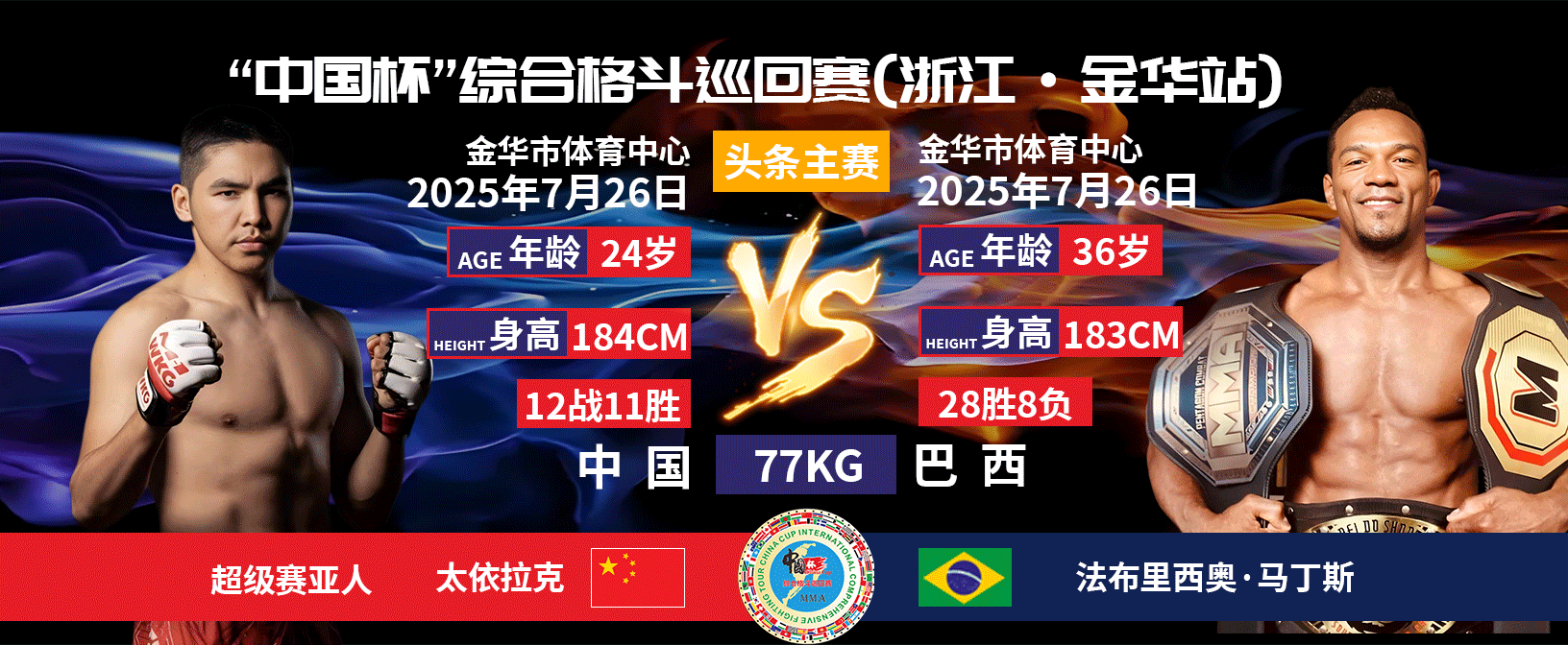 7月26日,中国杯综合格斗巡回赛浙江金华站即将在金华市体育中心举行,吸引了中、日、韩、美、俄等8个国家的30位顶尖拳手参加。他们之中既有MMA冠军级选手,也有崭露头角的新锐力量,他们将在擂台上展开高规格、高水准的热血对决。