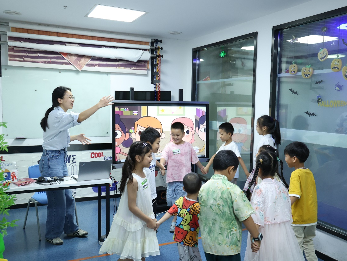 上午8点,教室里传来欢快的英语歌声。孩子们手拉着手,随着歌曲的节奏时而张开双臂将圆圈扩大,时而聚拢让圆圈缩小。英语游戏不仅能够激发孩子对英语的兴趣,还能在互动中学习并巩固英语单词和句子。