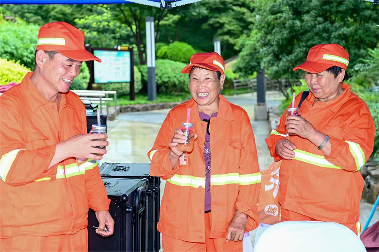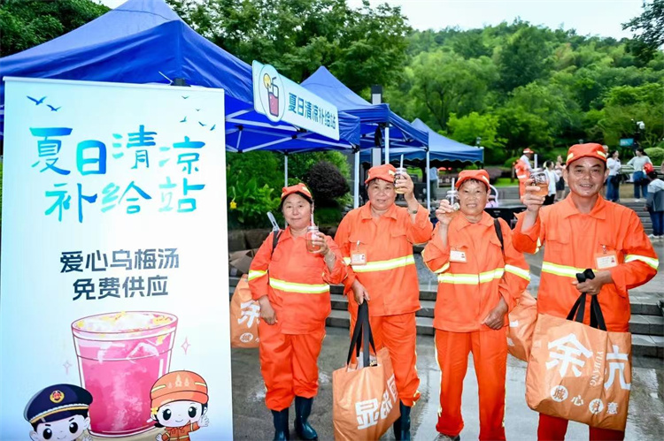 活动现场,高温慰问区暖意融融。浙江省中医院带来2000份解暑乌梅汤,志愿者为环卫工人、执法队员、外卖小哥等户外工作者提供健康体测和防暑知识咨询,市城管部门则送上装有挂脖风扇、速干毛巾的夏季慰问包。“作业时间避开烈日,城管驿站里凉茶不断,处处都是贴心照料。”余杭区环卫工人程彩云的话道出了大家的心声。