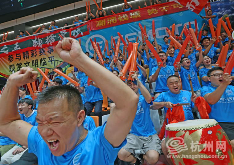场上激战正酣,场下“啦啦队”也很给力!观众席上,几位来自钱塘区下沙街道的阿姨打起别具传统特色的龙鼓,为钱塘队加油鼓劲。其中一名女士在采访中表示:“我们当中从事各行各业的都有,平时就在一起练习打鼓,今天也是一起来到现场。在现场看到钱塘队的表现非常出色,每一个人都在奋力向前,为家乡感到非常自豪!”
