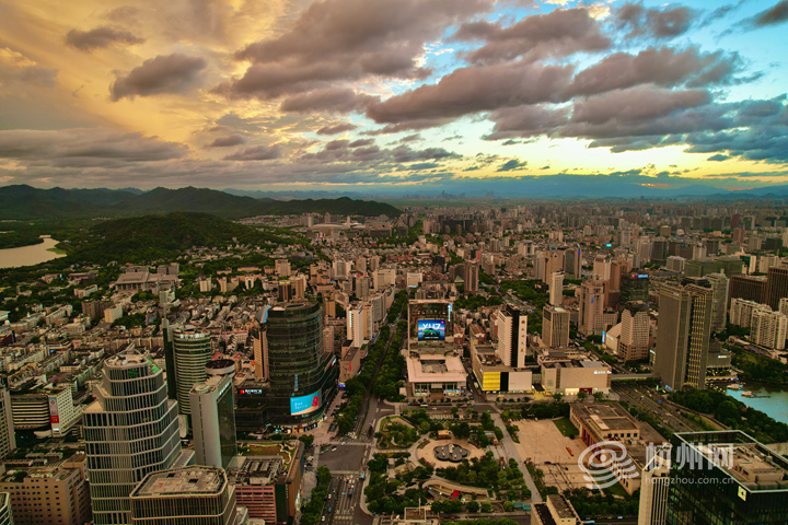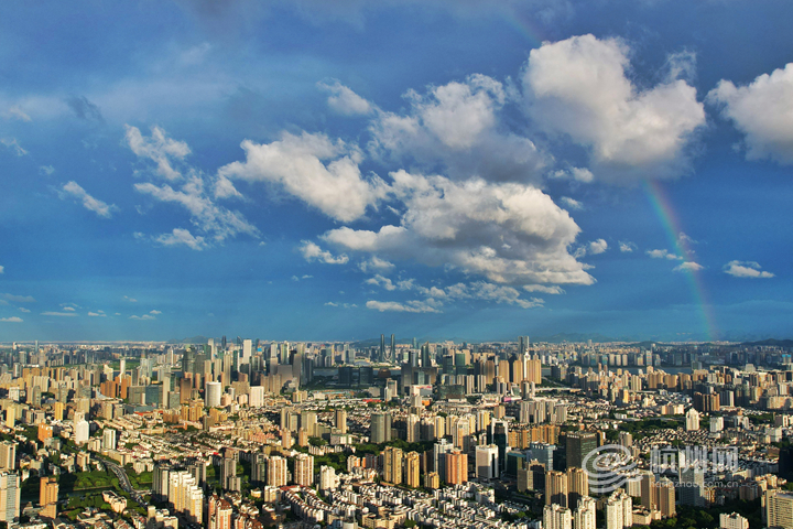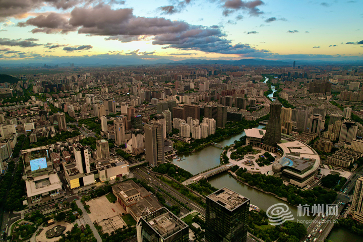 当日傍晚,杭城东边一场短暂降雨过后,天边迅速出现彩虹。彩虹横跨城市上空,与林立高楼相互映衬,构成一幅绝美的城市画卷。