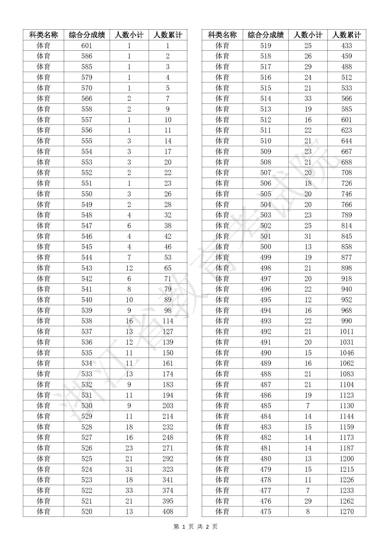 浙江省2025年普通高校招生体育类二段线上考生综合分分段表