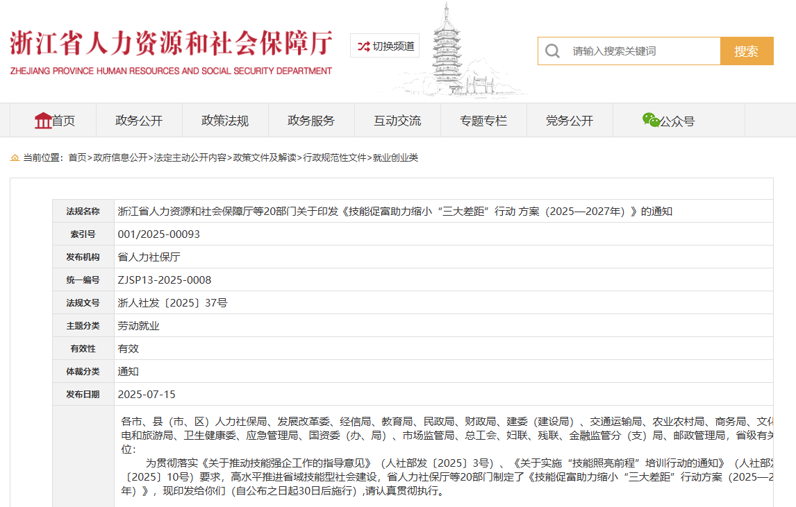 据浙江省人力社保厅官网消息,近日,浙江省人力社保厅、省发改委、省经信厅、省教育厅等20个部门联合印发《技能促富助力缩小“三大差距”行动方案(2025—2027年)》(以下简称《行动方案》)。其中,《行动方案》明确,强化职业学校技能培训支撑作用,加强大学生就业技能培训。