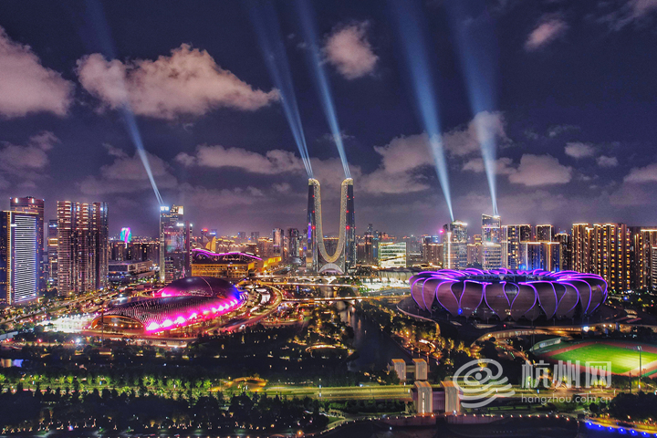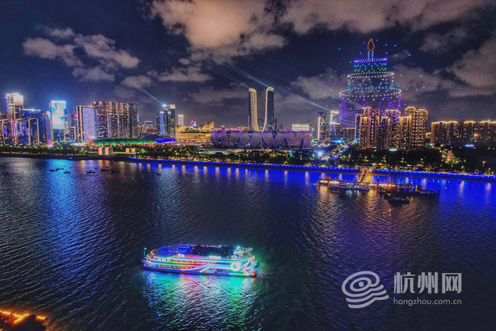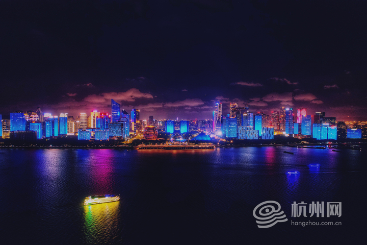 与此同时,钱塘江两岸灯光璀璨,与天空中的晚霞相互映衬,形成了独特的城市夜景。江面上,游船缓缓驶过,波光粼粼,为这幅画面增添了几分灵动与浪漫。