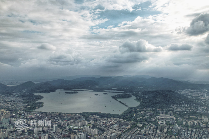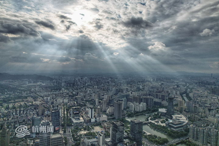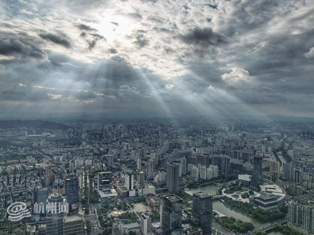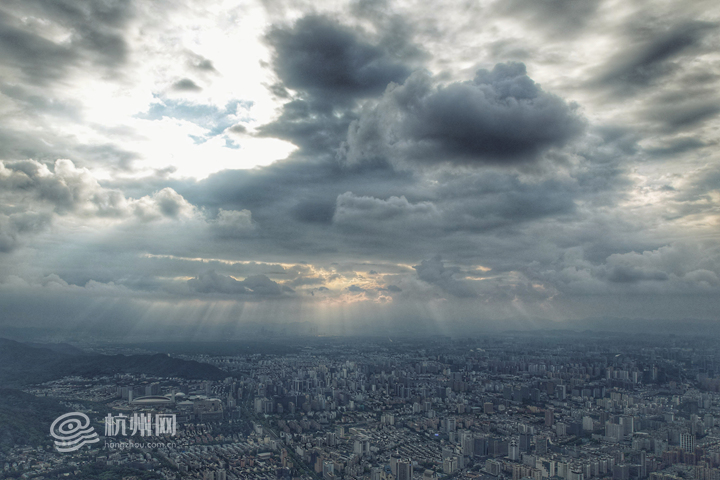 7月29日傍晚,杭州天空被厚重乌云笼罩,光线暗沉如墨,今年第8号台风“竹节草”的影响已悄然显现。