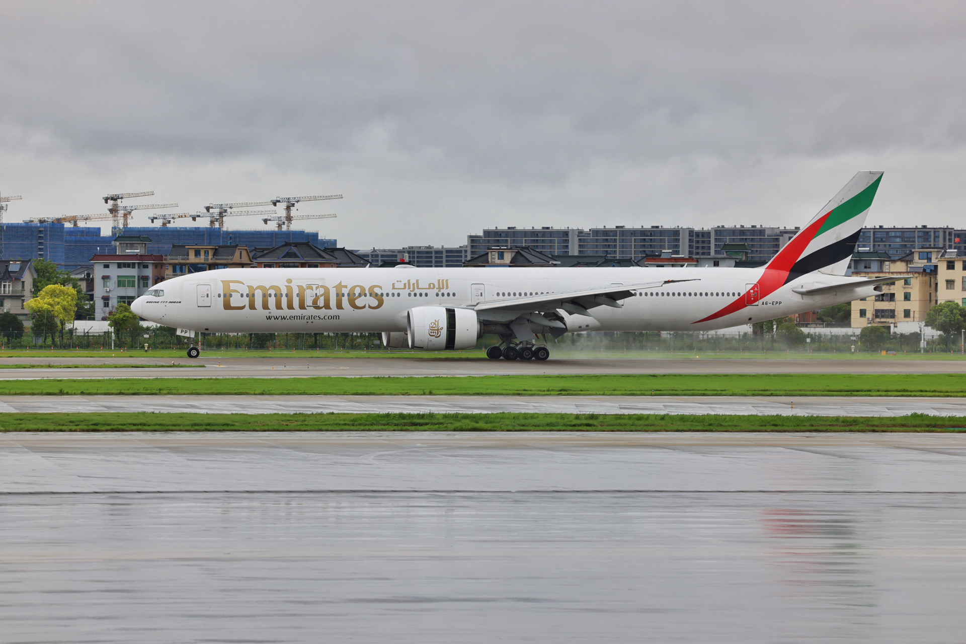阿联酋航空EK310航班落地杭州机场 谭申捷/摄