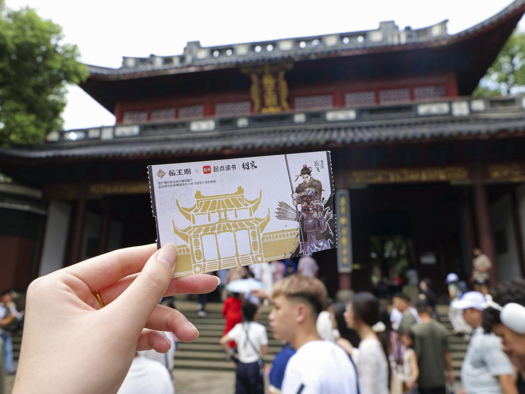 活动由杭州岳王庙联合阅文集团旗下起点读书联合举办,将持续至9月7日。据杭州西湖风景名胜区岳庙管理处文化旅游科科长胡亮介绍,活动期间,游客可参与多项内容,包括:获取《绍宋》限量版定制门票及打卡折页、体验“起点书局”书签DIY、在忠烈祠、南枝巢等地标处进行打卡等,游客将沉浸式体验“岳飞传说”与“春秋岳王祭”两项非物质文化遗产的独特魅力。本次活动开幕式还特别发售了文创产品“定胜枪”,笔身采用金属质感的青玉色设计,拿在手中仿佛能触摸到岳将军当年的刚毅风骨,它也是文化与实用的巧妙融合,搭配指尖风火轮的解压旋转功能,该文创产品于8月1日至9月7日在杭州岳王庙限定发售。