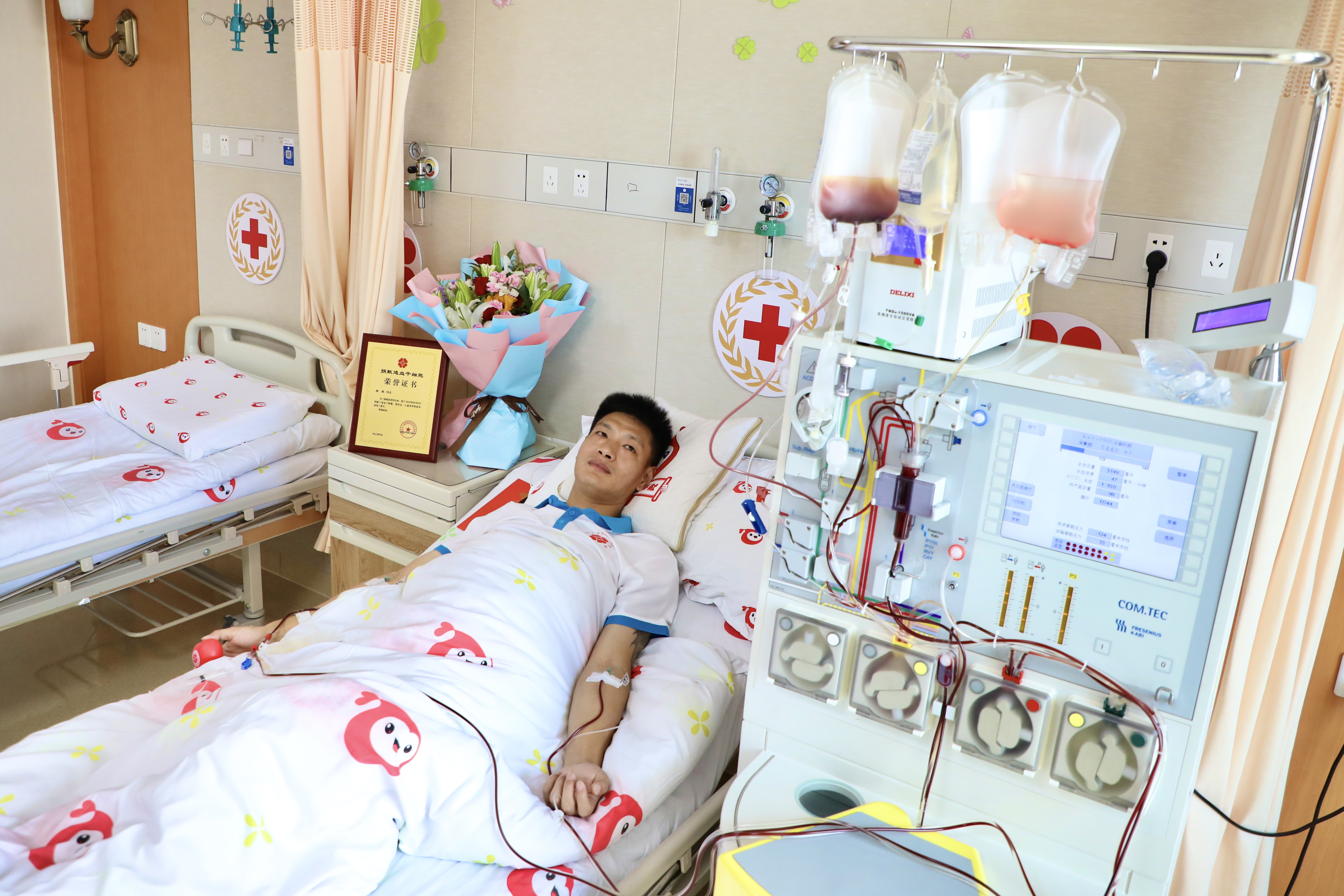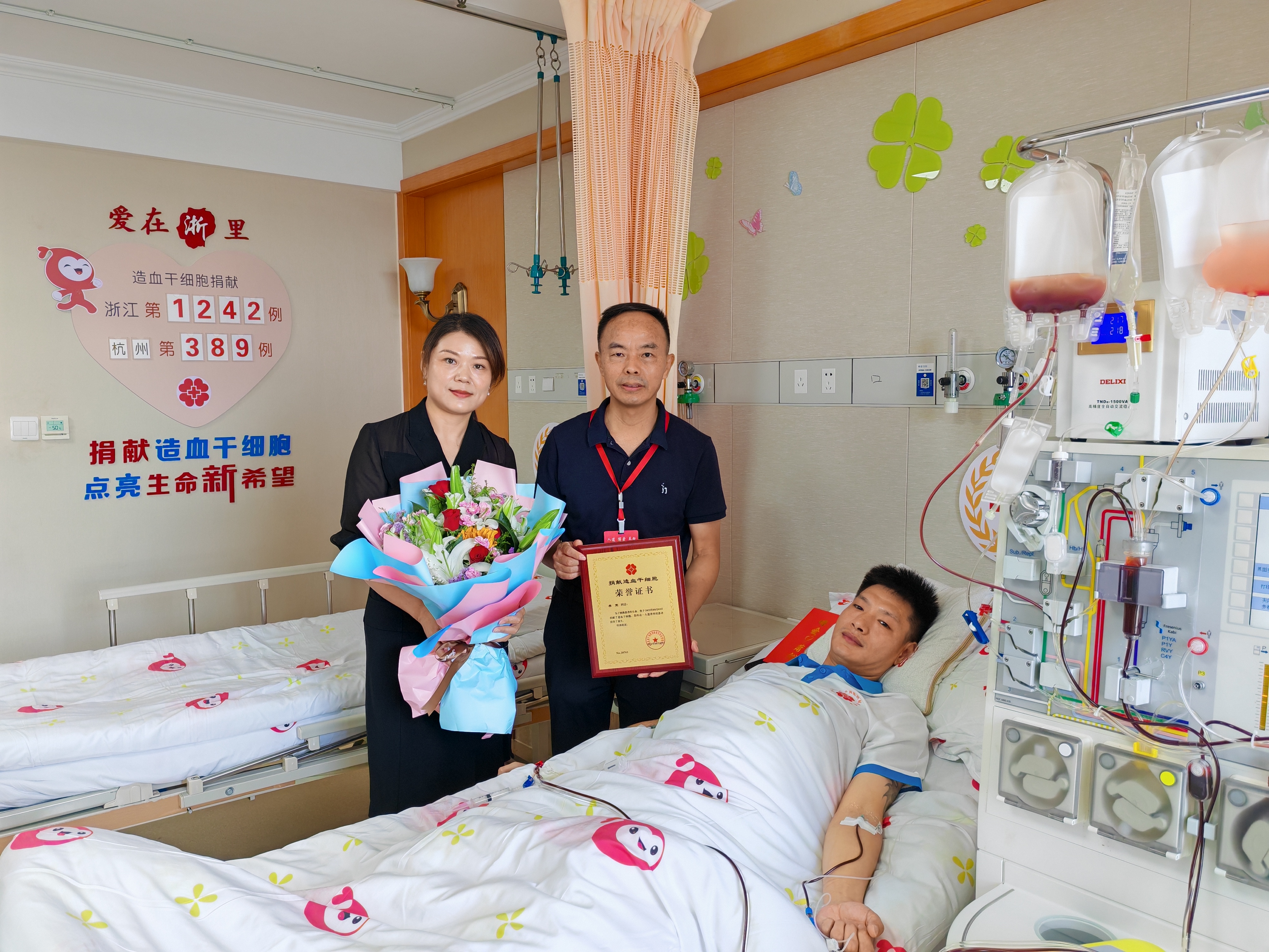 8月5日,在杭州某造血干细胞采集室里,历经5个多小时的采集,李宽成功捐献240毫升造血干细胞混悬液,成为浙江省第1242例、杭州市第389例造血干细胞捐献者。