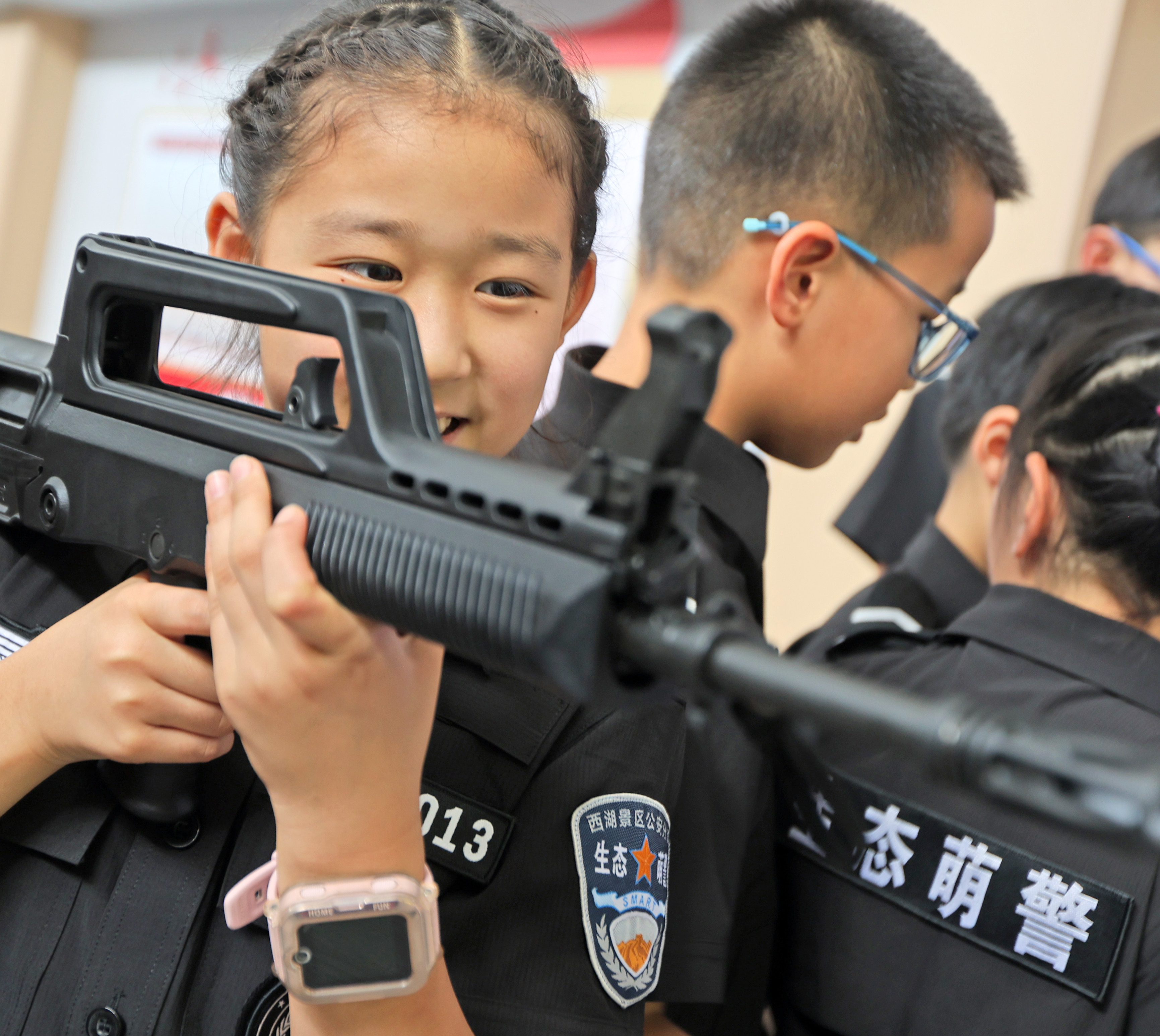警务装备展示环节更是让孩子们大开眼界。防弹衣、头盔、手铐等平时只能在电视里看到的装备一一呈现在眼前。民警叔叔详细地介绍着每一种装备的用途和使用方法,孩子们围成一圈,好奇地睁大眼睛,有的孩子还小心翼翼地伸手触摸,时不时发出 “哇” 的惊叹声。在警务技能训练展示中,教官们展示了擒拿格斗等技能,矫健的身手、利落的动作让孩子们看得目不转睛,纷纷拍手叫好。