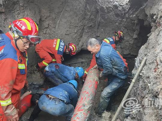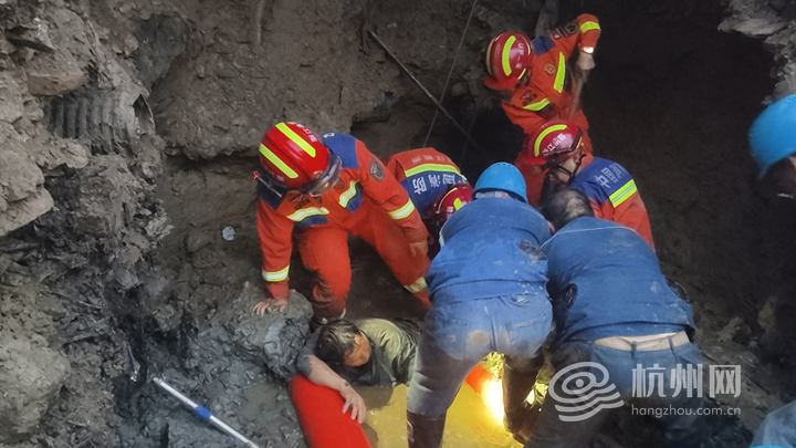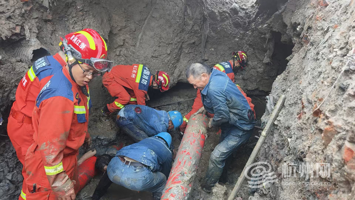 乔司消防救援站接到报警时,时钟指向5时03分。救援人员抵达现场后看到,发生事故的施工坑道较深,一侧泥土突然垮塌形成漏斗状塌陷区,被困工人下半身完全被湿软泥土吞没,坑底积水已没过其腰部。更危急的是,一根破裂的管道正持续向坑内注水,浑浊的泥水不断冲刷着松动的土层,随时可能引发二次坍塌。